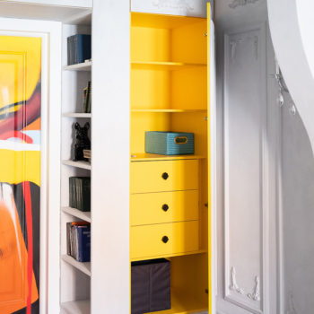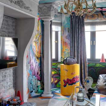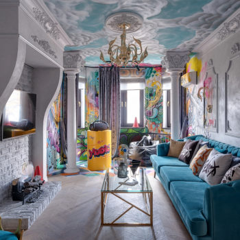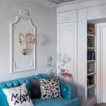 Этот прием лег в основу всего интерьера, который получился ярким и дерзким. Дух бунтарства и свободы на фоне нарочитого барокко, стрит-арт и классика. Под стать хозяевам этой гостиной – молодой, эксцентричной и очень творческой паре.