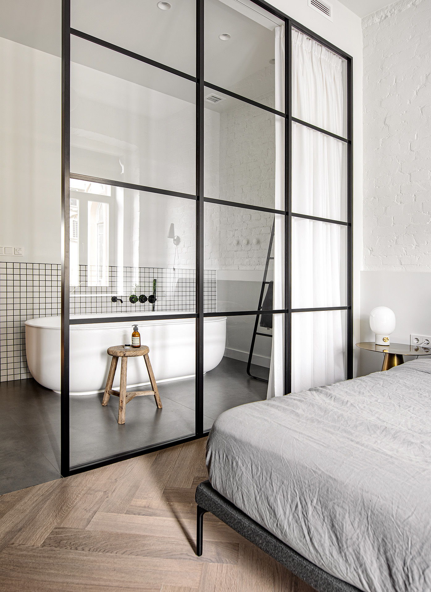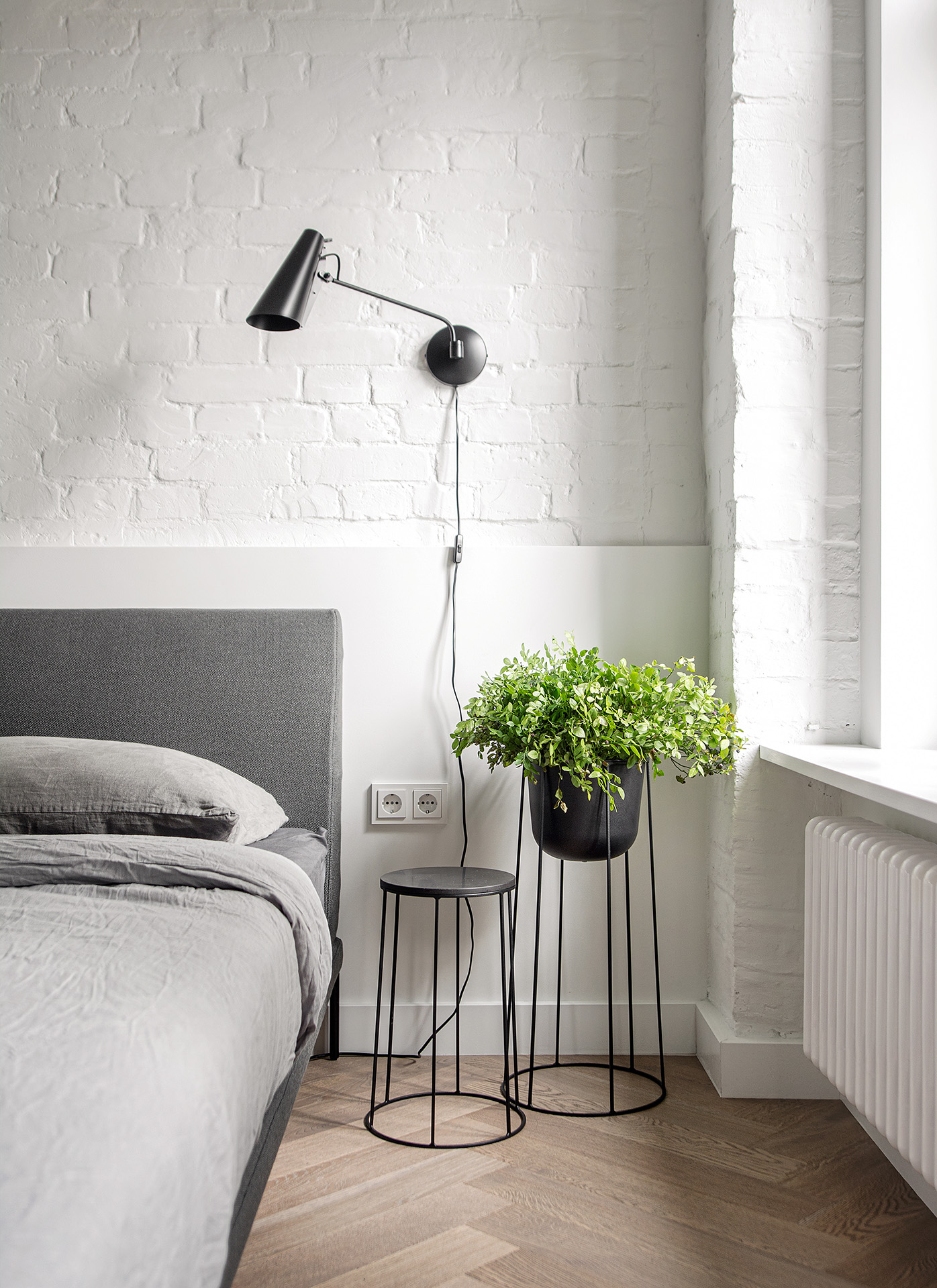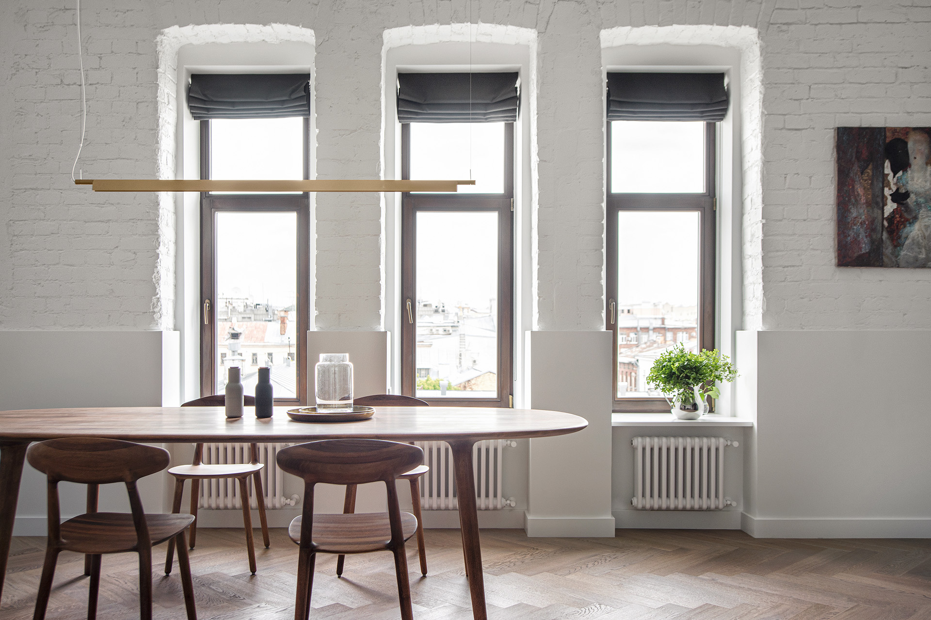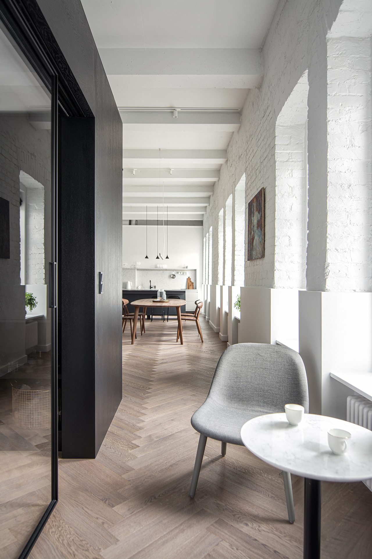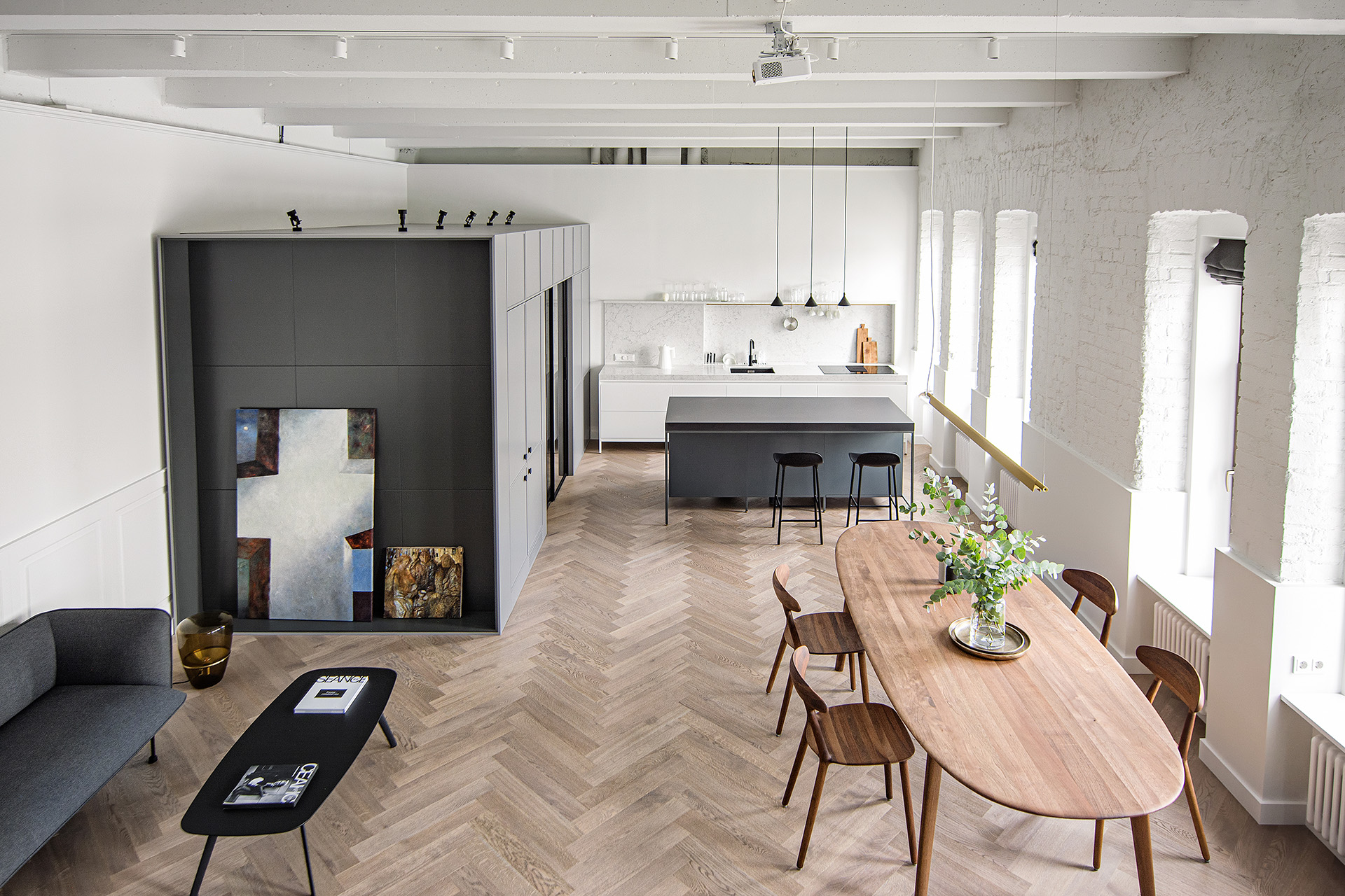 Контраст строгих белых стен и темной минималистичной мебели смягчает дубовый паркет теплого соломенного оттенка, созвучного элементам мебели из натурального дерева. Классический рисунок английской елки подчеркивает аутентичность кирпичной кладки и бетонного потолка с балками, вплетая этот абсолютно современный интерьер в контекст исторического здания.