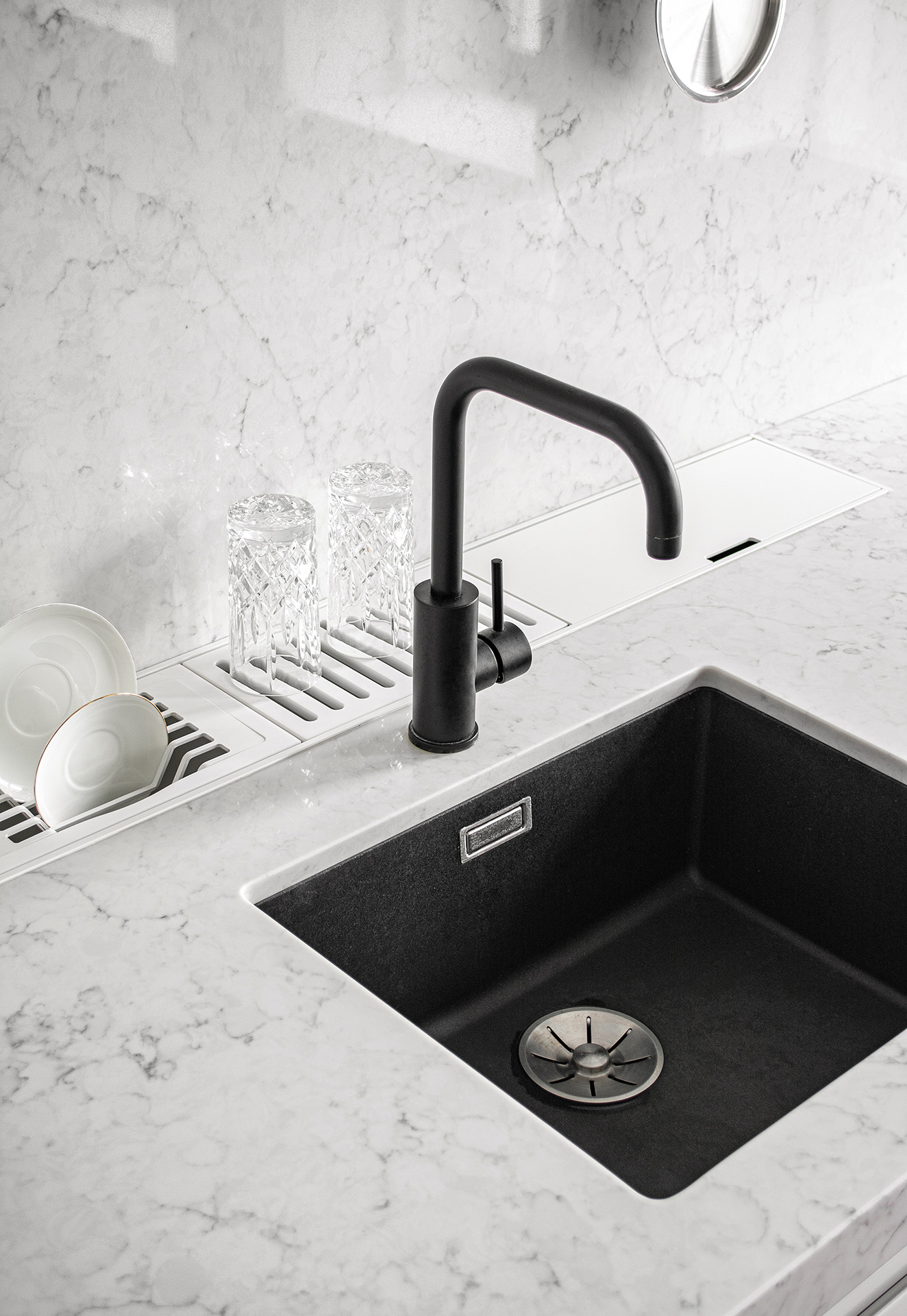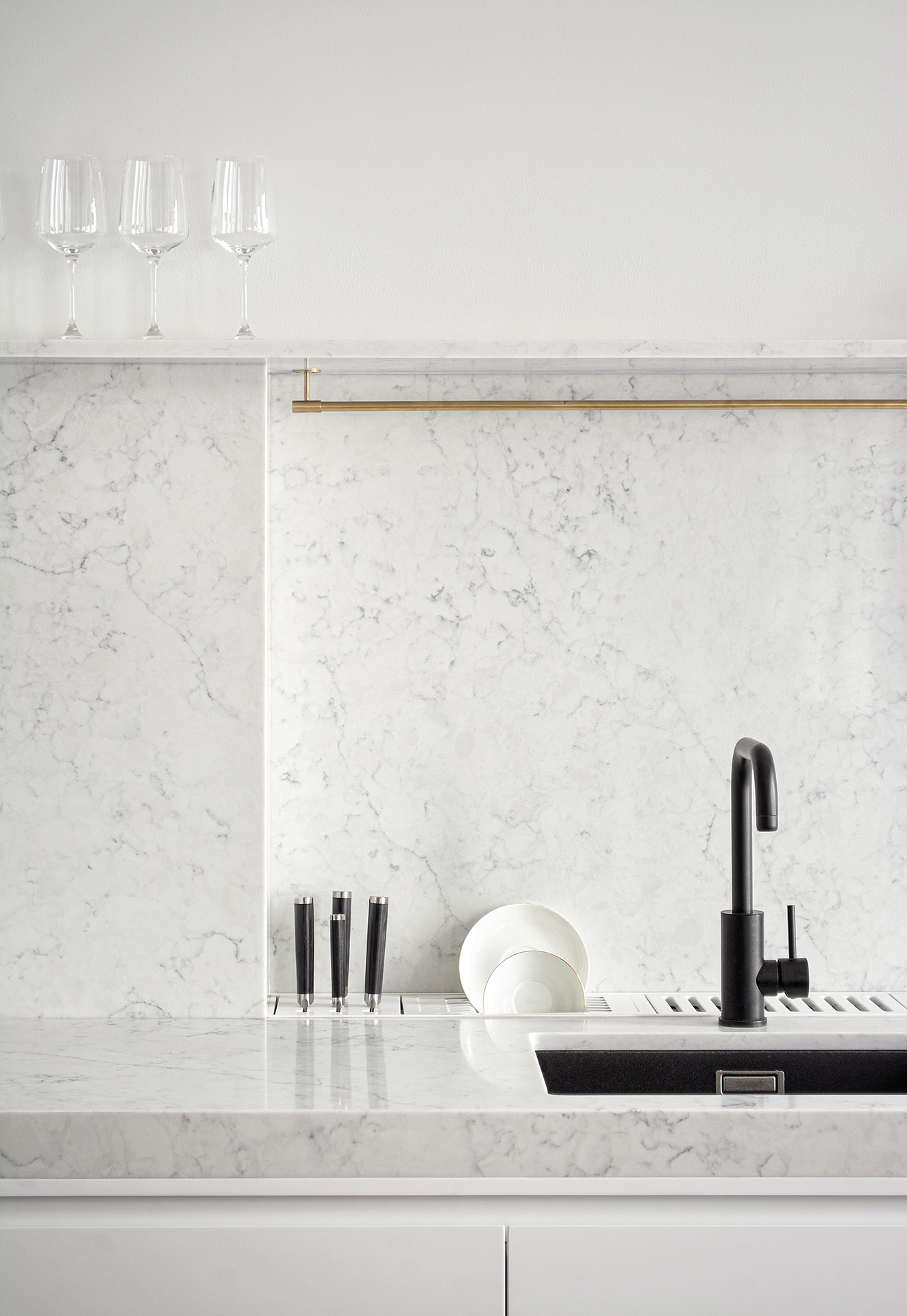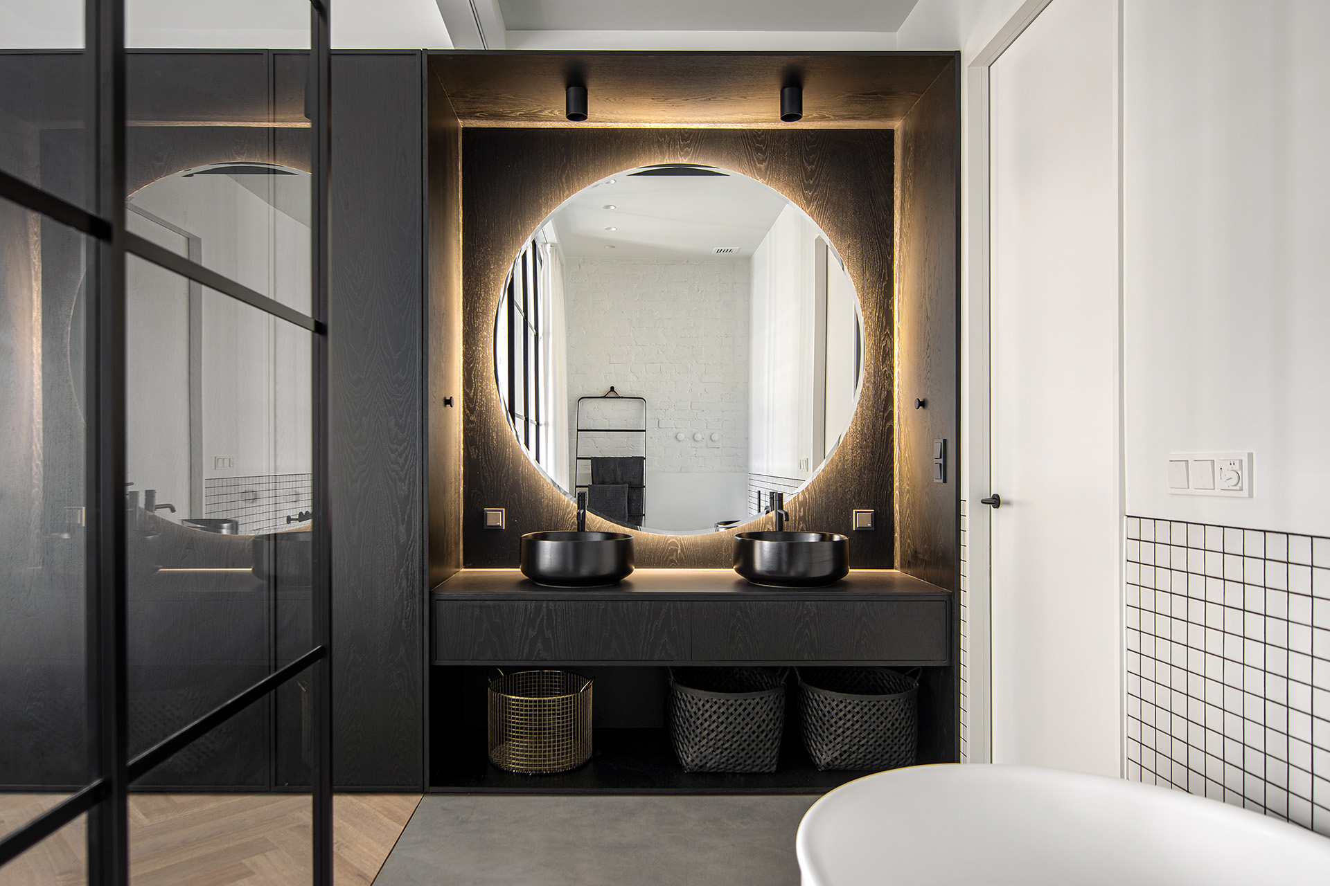 Coswick-Chamboard-Parket-25Апартаменты площадью 114 кв.м расположены в здании исторического особняка начала XX века с видом на одну из старинных улиц Москвы. Это и определило концепцию интерьера. Хотелось сохранить архитектуру и объем помещения с исторической кирпичной кладкой, четким ритмом потолочных балок и девятью окнами. И при этом разместить все необходимые функциональные зоны. Решением стало создание двух субпространств – боксов, не доходящих до потолка, в одном из которых разместились гостевая спальня с кладовой, антресоль на крыше и библиотека, а в другом – прихожая, санузел и часть кухни. Вокруг боксов распределены остальные зоны: кухня-столовая, диванная зона и уютное место для завтраков. В то же время основная спальня, как и положено, изолирована.