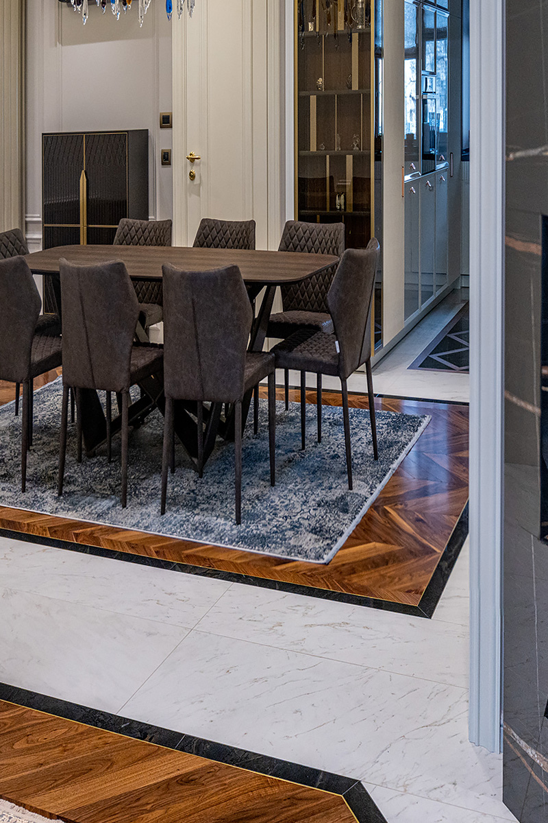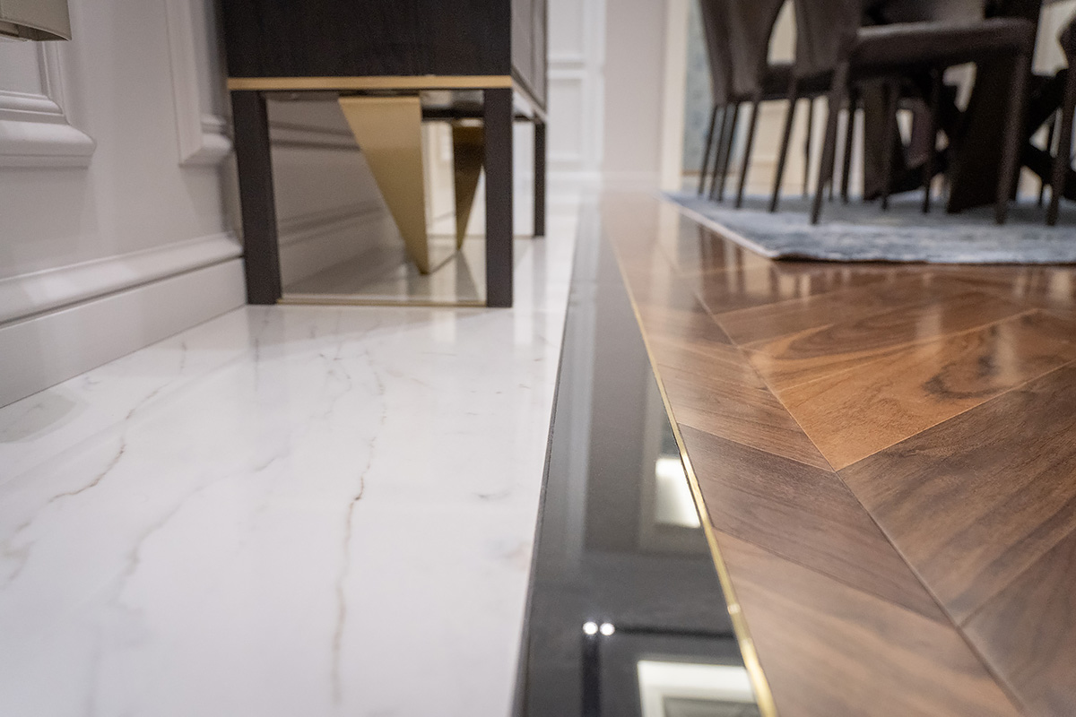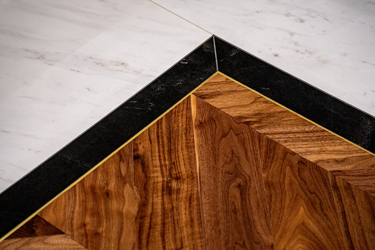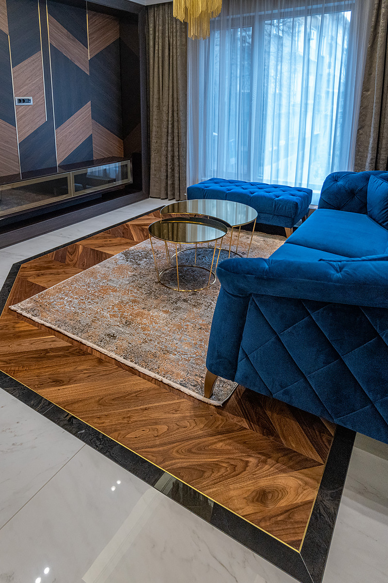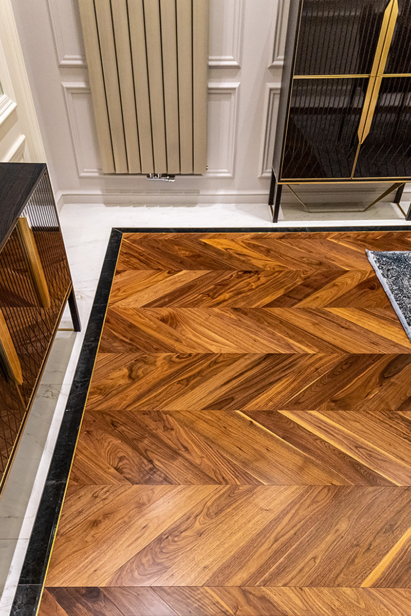 Coswick-oak-flax-1N (18)Ювелирная работа болгарских мастеров. Сочетание камня и дерева в напольном покрытии требует исключительной точности и аккуратности. А в этом проекте присутствует и акцентная латунная вставка по периметру паркетных «ковров» из французской елки в американском орехе. У каждого материала свой «характер», особенности укладки и реакция на климат в помещении. Соединить их в эффектное единое полотно так, чтобы в дальнейшем напольное покрытие сохраняло свой первозданный вид, – задача, которая под силу только настоящим профессионалам.