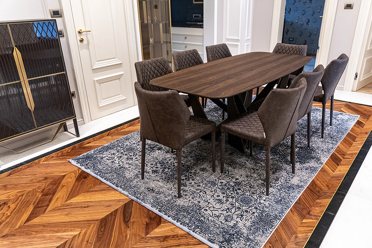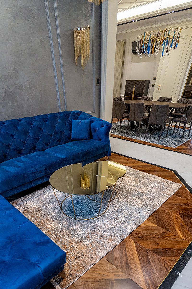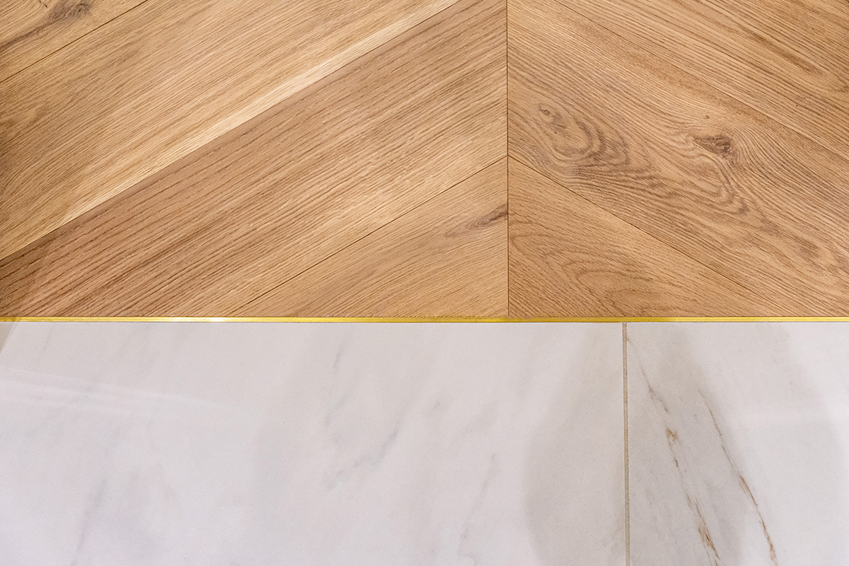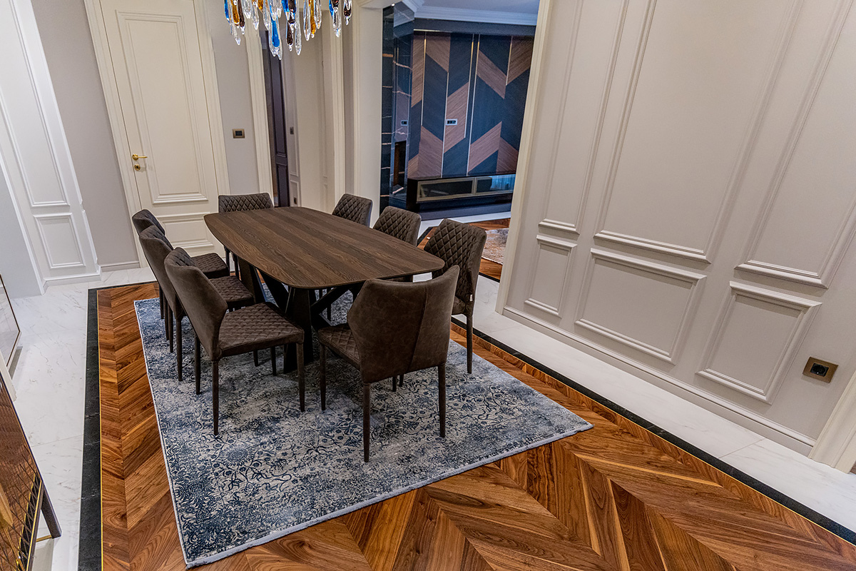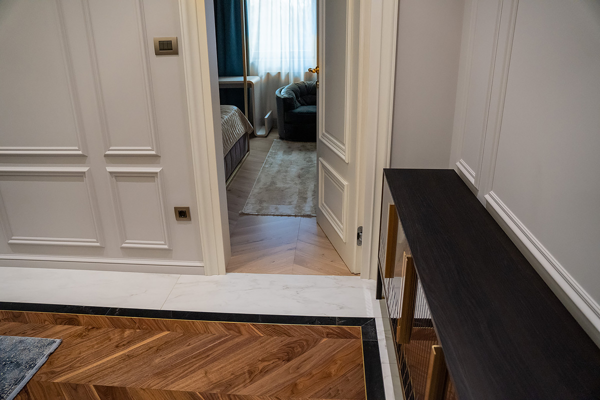 Coswick-oak-flax-1N (18)Ювелирная работа болгарских мастеров. Сочетание камня и дерева в напольном покрытии требует исключительной точности и аккуратности. А в этом проекте присутствует и акцентная латунная вставка по периметру паркетных «ковров» из французской елки в американском орехе. У каждого материала свой «характер», особенности укладки и реакция на климат в помещении. Соединить их в эффектное единое полотно так, чтобы в дальнейшем напольное покрытие сохраняло свой первозданный вид, – задача, которая под силу только настоящим профессионалам.