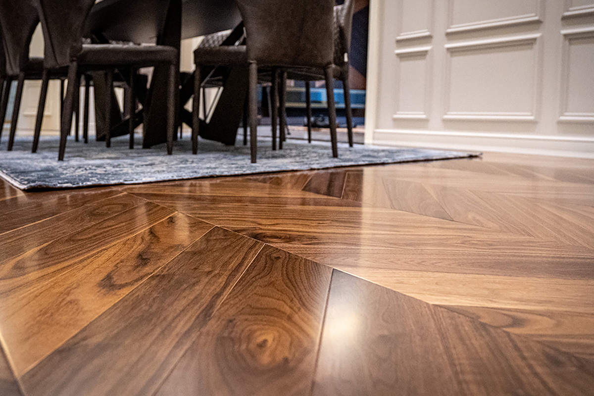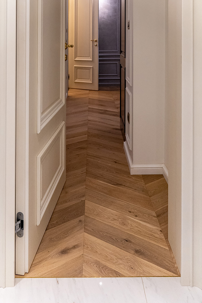 В проекте использован паркет Coswick «французская елка» Орех Традишинал и Bonnard «французская елка» дуб Льняной.