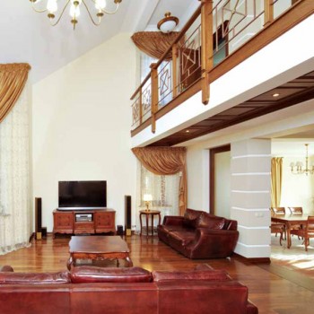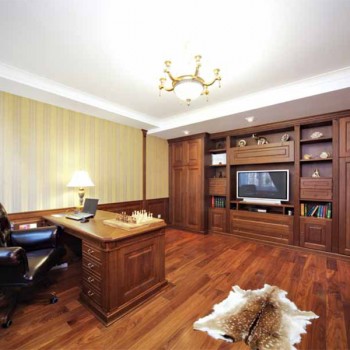 Материалы соответствуют общей стилистике: связующим звеном всех комнат и основой интерьера в целом стали отделка и мебель из дуба. Присутствуют традиционные для классики колонны и стилизованные под них декоративные элементы. Так, в гостиной, столовой и прихожей они выполняют несущую функцию. В кабинете деревянные пилястры помогают визуально увеличить высоту комнаты: здесь потолки ниже, чем в других помещениях, поскольку первый этаж двухуровневый. В основу цветового решения лег принцип контрастности: темная деревянная мебель отлично выглядит на фоне светлых стен.