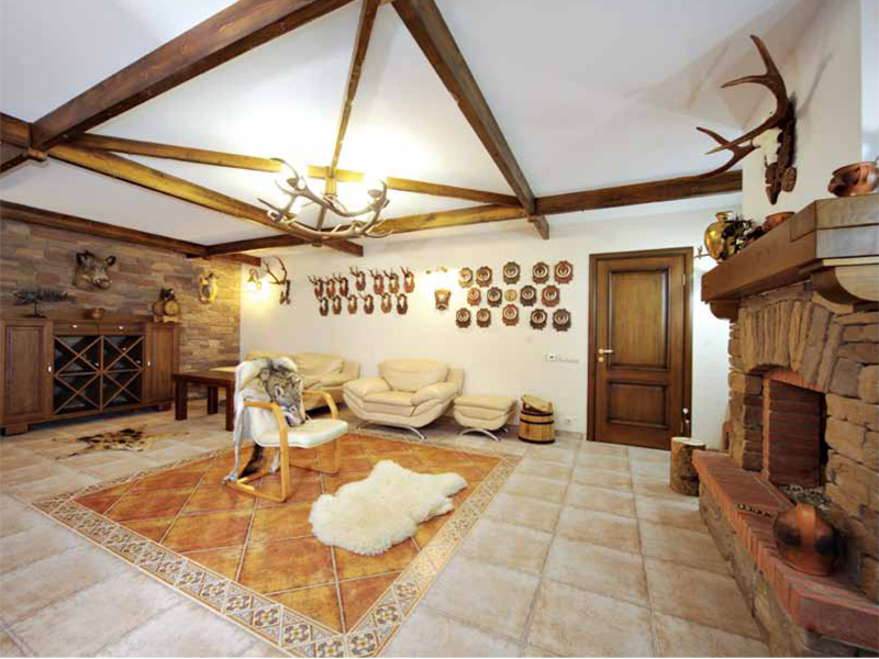 Часто подобное убранство, традиционное, скорее, для родовых поместий ХIX века, кажется надуманным и искусственным. Здесь все иначе: данная стилистика обусловлена не только стремлением подчеркнуть приверженность вечным ценностям, но и образом жизни. Мужчина в этой семье – в полном смысле глава и добытчик, а отдельный рабочий кабинет – не просто атрибут стиля, но необходимость. Кроме этого, хозяин еще и охотник, и всем его трофеям требовалось найти место. Идеальным решением оказалась отдельная охотничья комната. Так в цокольном этаже появился большой зал, в котором удобно и уединиться, и провести время в компании друзей. Хозяйка тоже не в обиде: просторная функциональная кухня и большая столовая, где можно радовать кулинарными изысками гостей – мечта любой хранительницы семейного очага. А еще гостиная с камином, спальни для мальчика и девочки, отдельные санузлы для гостей, родителей и детей – возможности загородного дома использовали сполна.