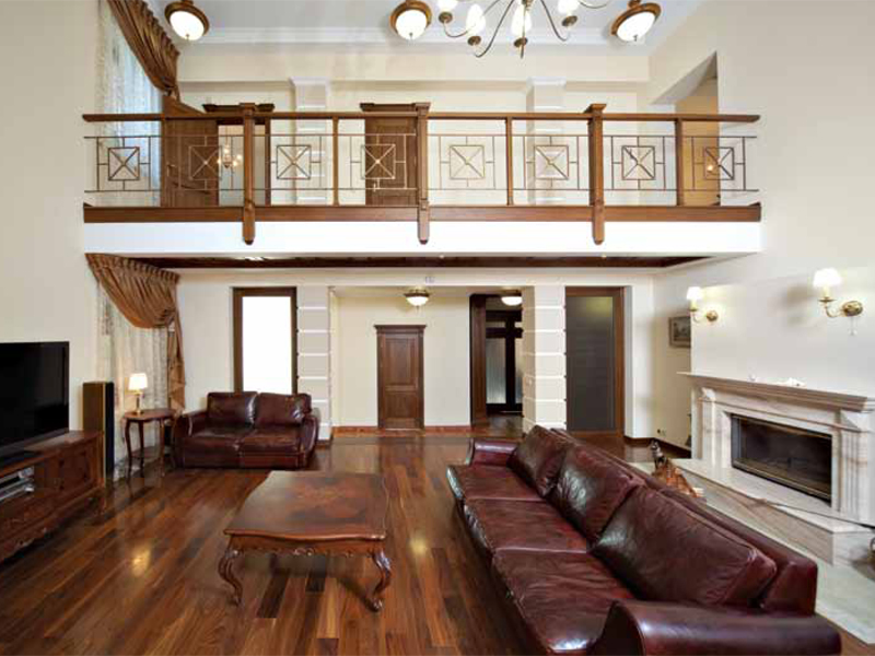 Материалы соответствуют общей стилистике: связующим звеном всех комнат и основой интерьера в целом стали отделка и мебель из дуба. Присутствуют традиционные для классики колонны и стилизованные под них декоративные элементы. Так, в гостиной, столовой и прихожей они выполняют несущую функцию. В кабинете деревянные пилястры помогают визуально увеличить высоту комнаты: здесь потолки ниже, чем в других помещениях, поскольку первый этаж двухуровневый. В основу цветового решения лег принцип контрастности: темная деревянная мебель отлично выглядит на фоне светлых стен.