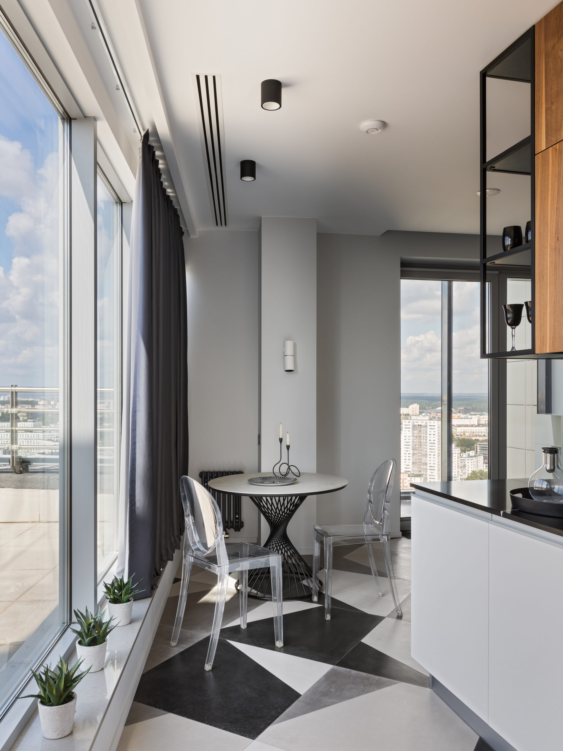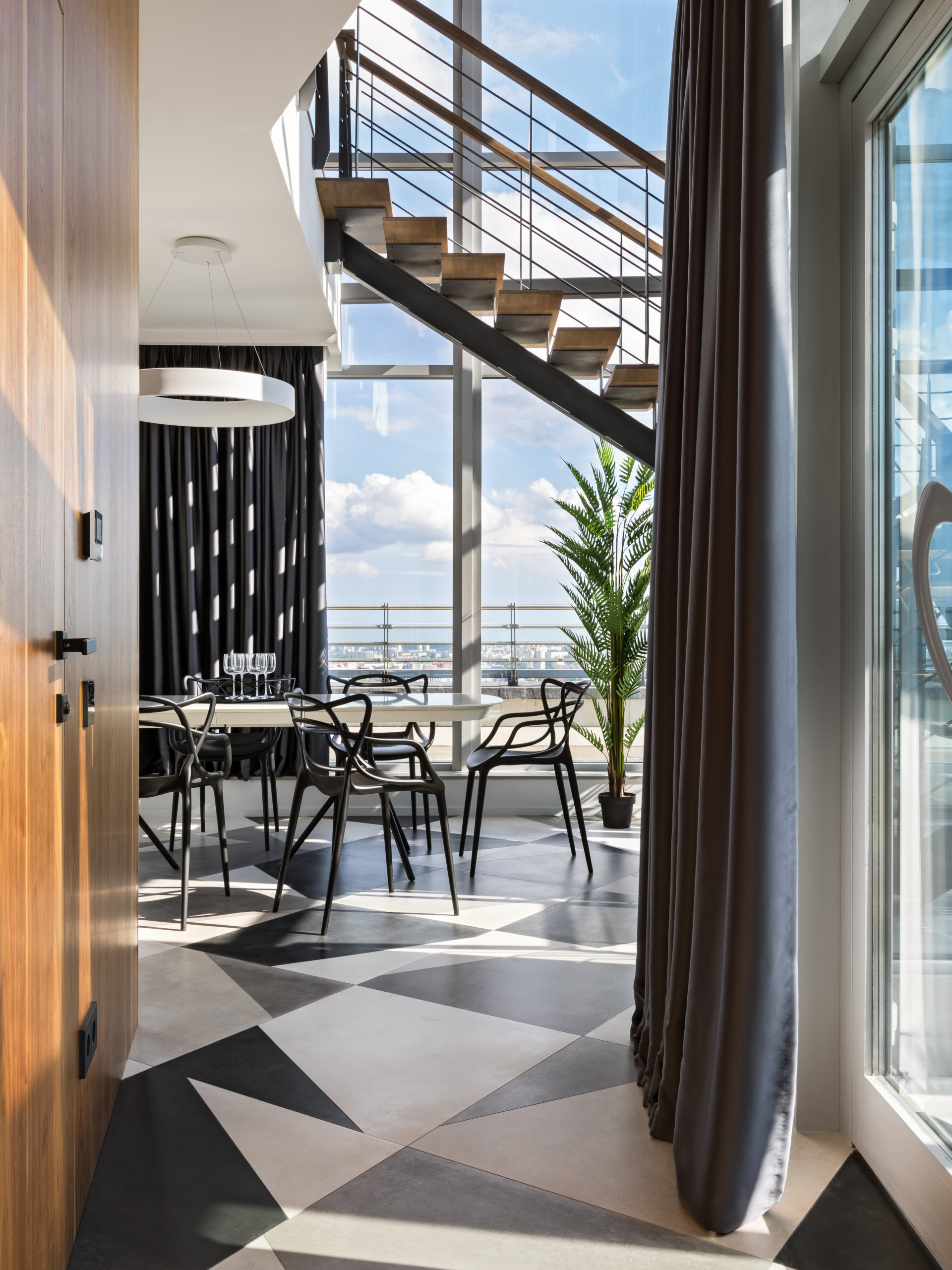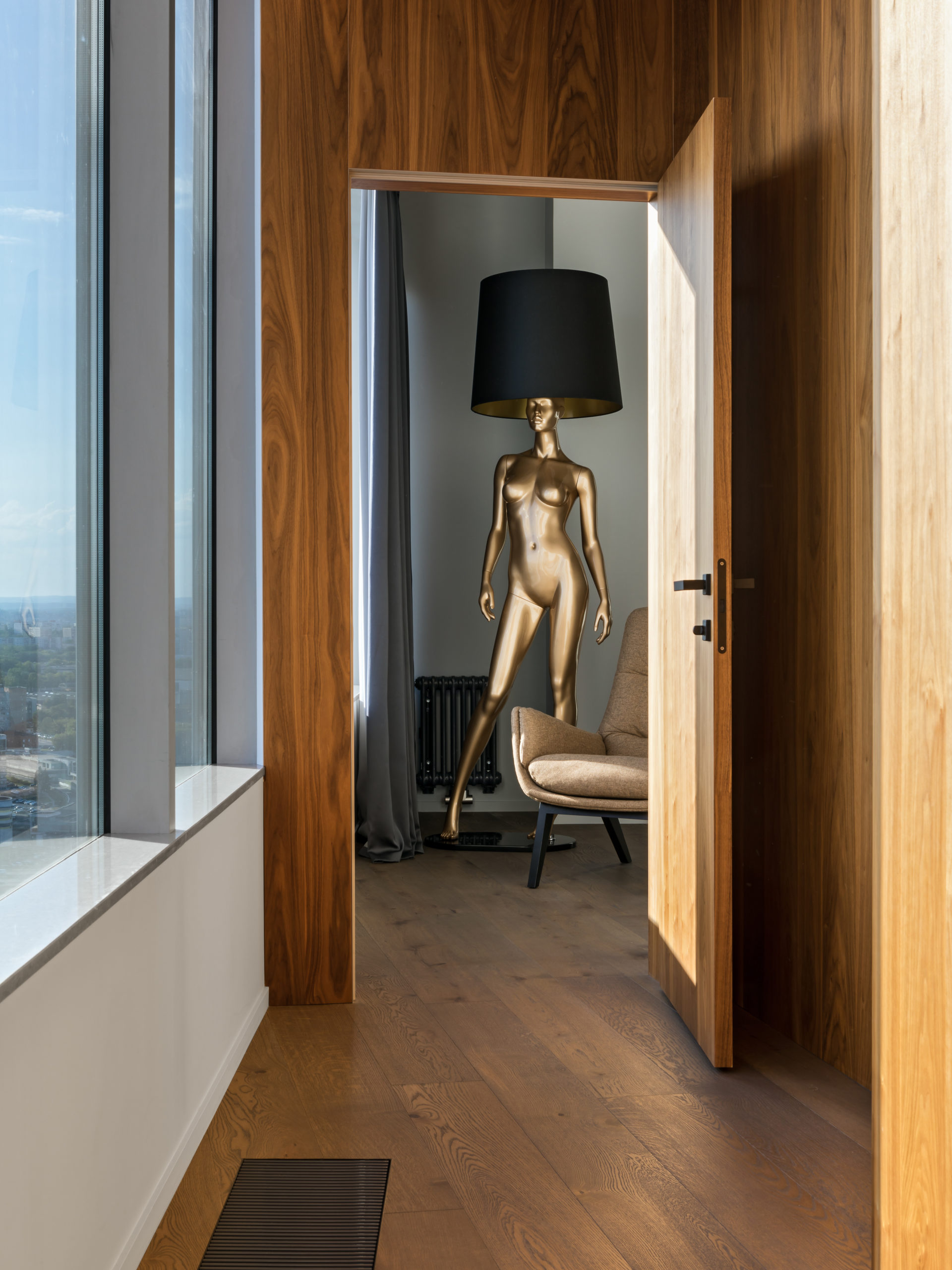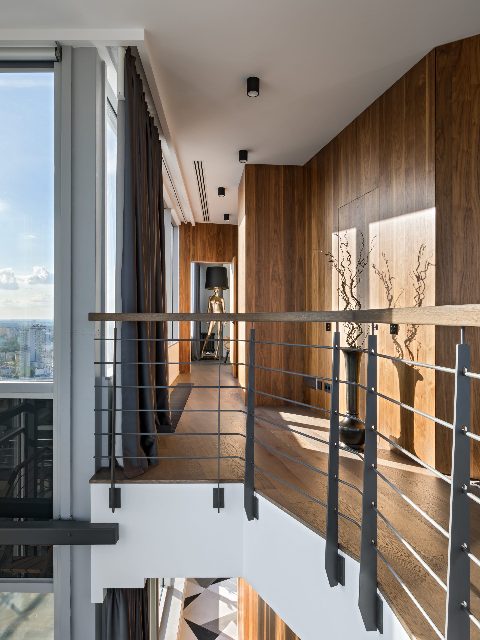 Coswick-Old_Venice-Parket-17Двухуровневый пентхаус в минской высотке с потрясающей панорамой из огромных окон и просторной террасой. Исходную планировку с узкими и длинными помещениями квартиры в 180 кв.м необходимо было правильно зонировать и создать светлое, просторное и удобное для всех членов семьи жилое пространство, но со своим характером. Ключевым элементом концепции интерьера стали стеновые панели и мебельные фасады, покрытые шпоном натурального дуба. Они создают хороший фон для предметов мебели и декора в сдержанной цветовой гамме.