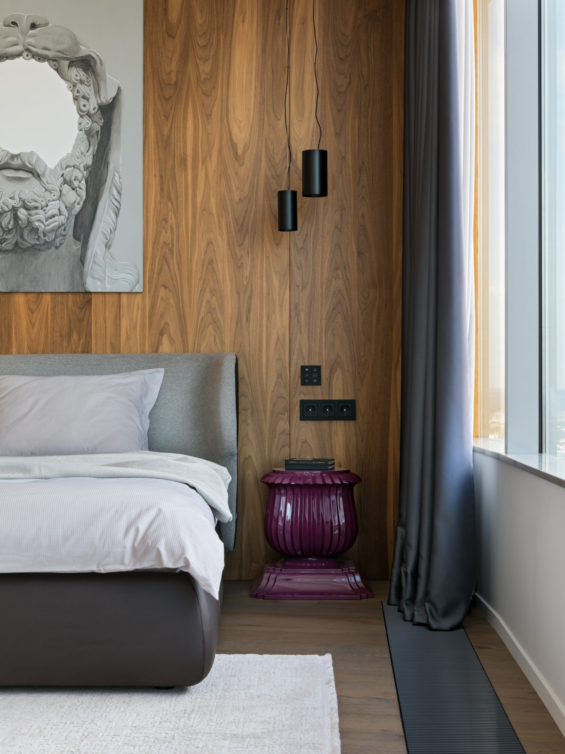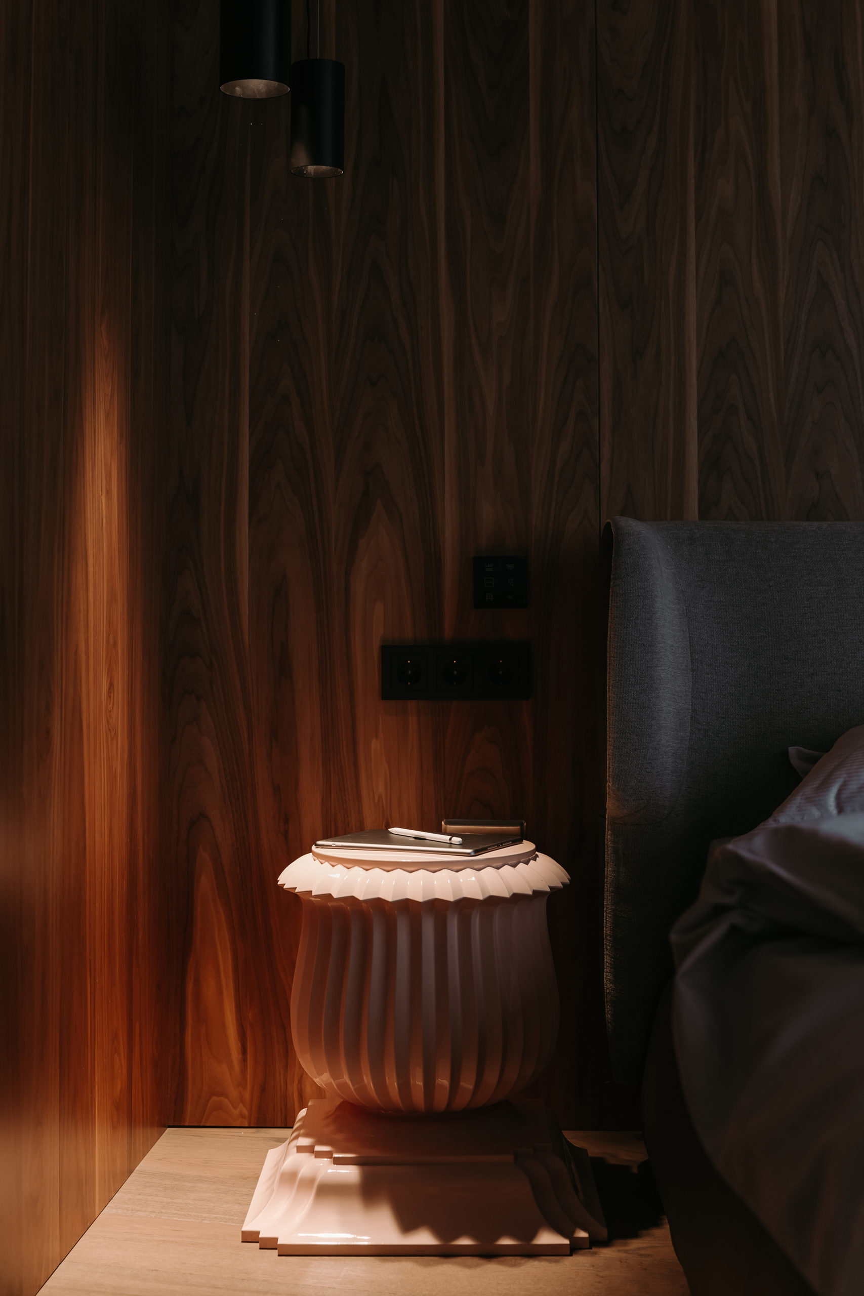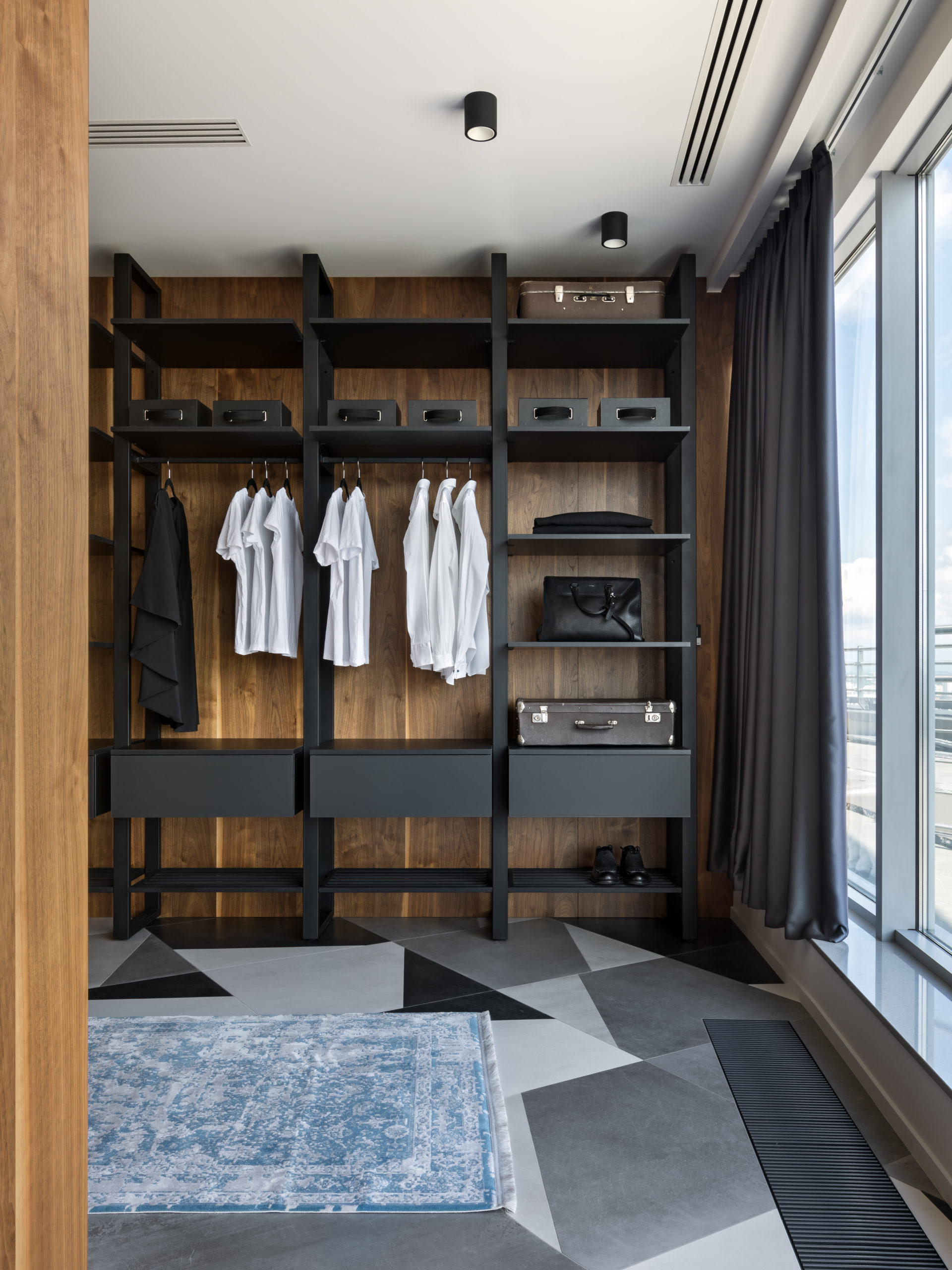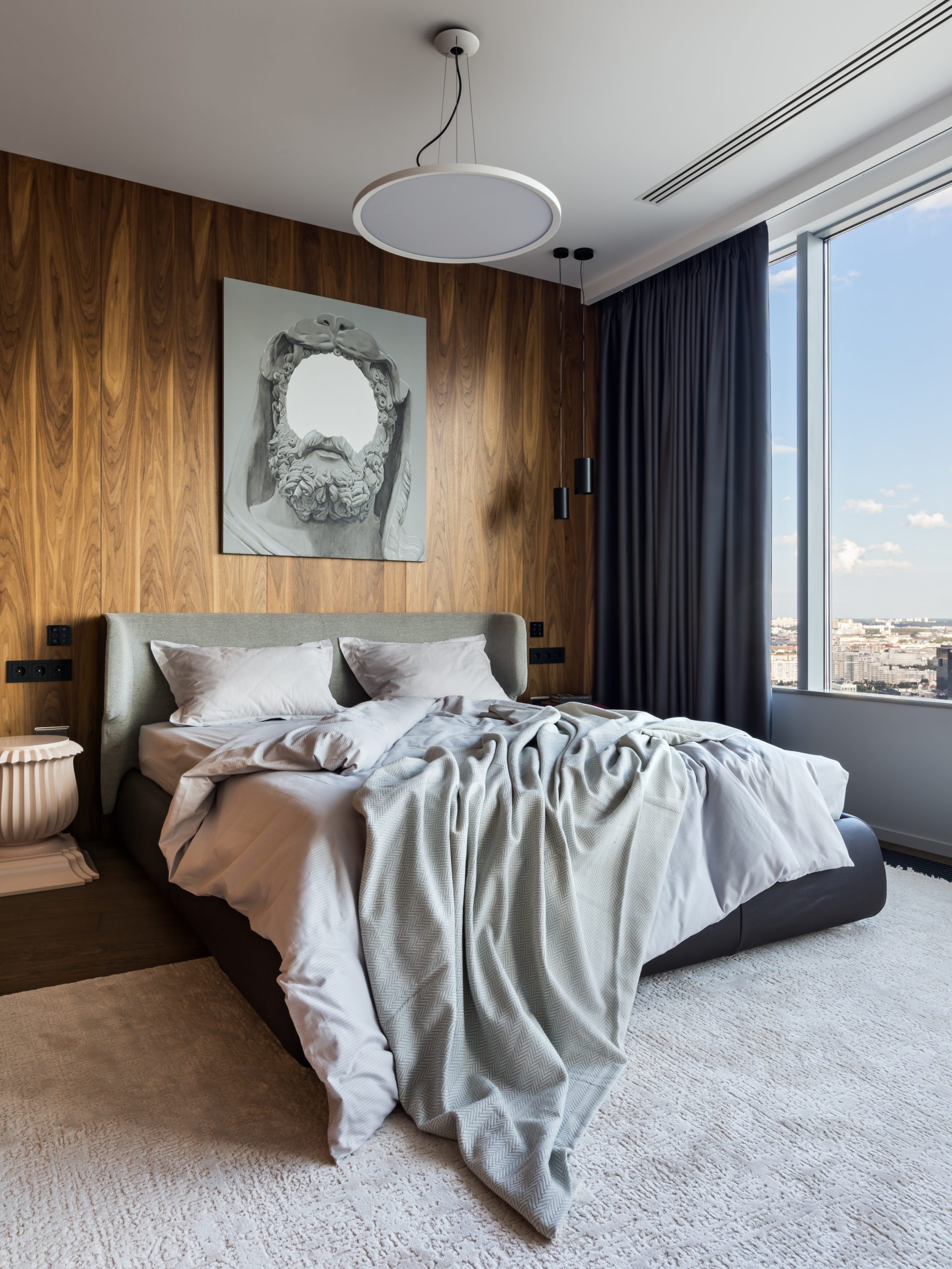 Coswick-Old_Venice-Parket-17Двухуровневый пентхаус в минской высотке с потрясающей панорамой из огромных окон и просторной террасой. Исходную планировку с узкими и длинными помещениями квартиры в 180 кв.м необходимо было правильно зонировать и создать светлое, просторное и удобное для всех членов семьи жилое пространство, но со своим характером. Ключевым элементом концепции интерьера стали стеновые панели и мебельные фасады, покрытые шпоном натурального дуба. Они создают хороший фон для предметов мебели и декора в сдержанной цветовой гамме.