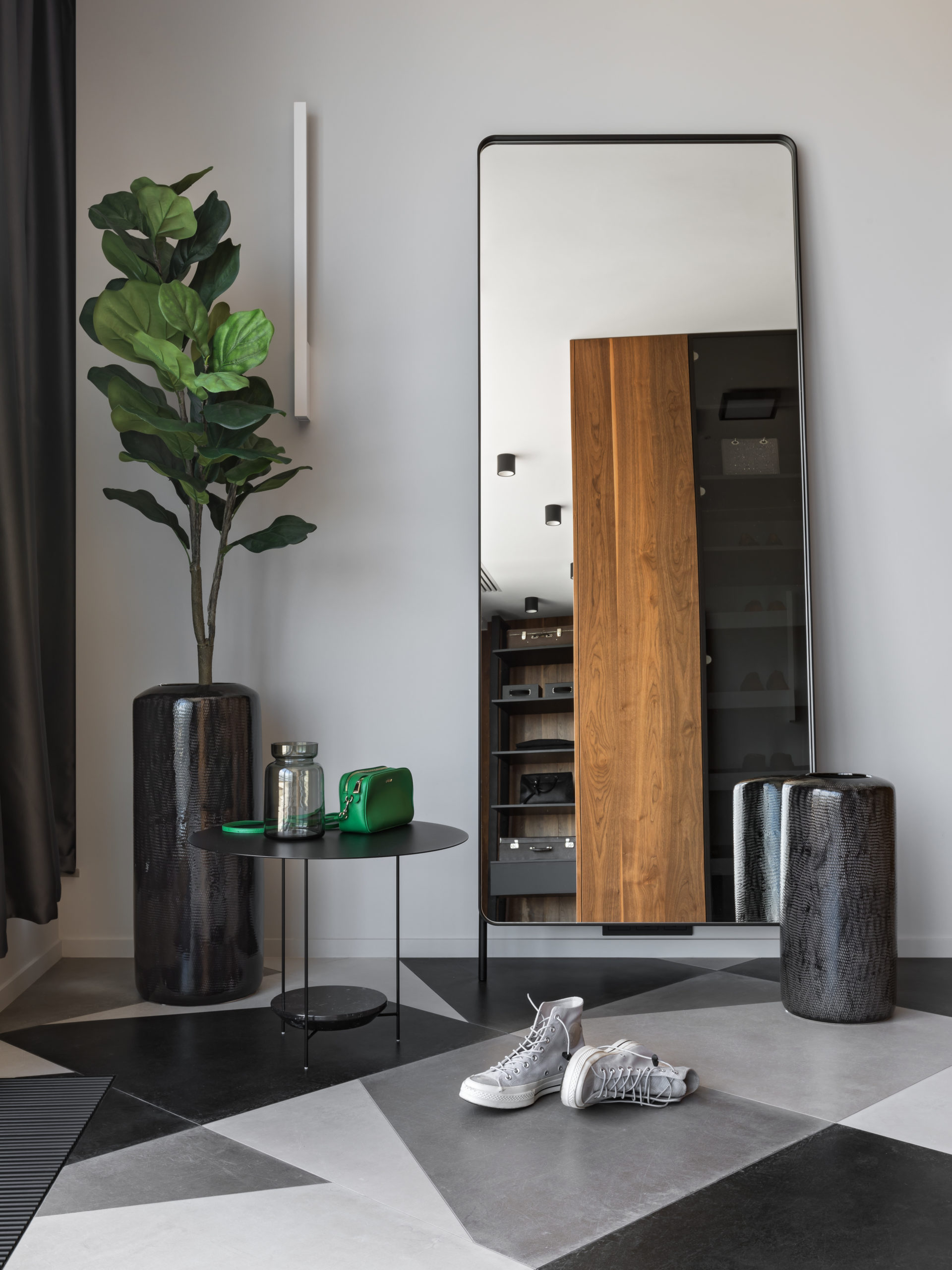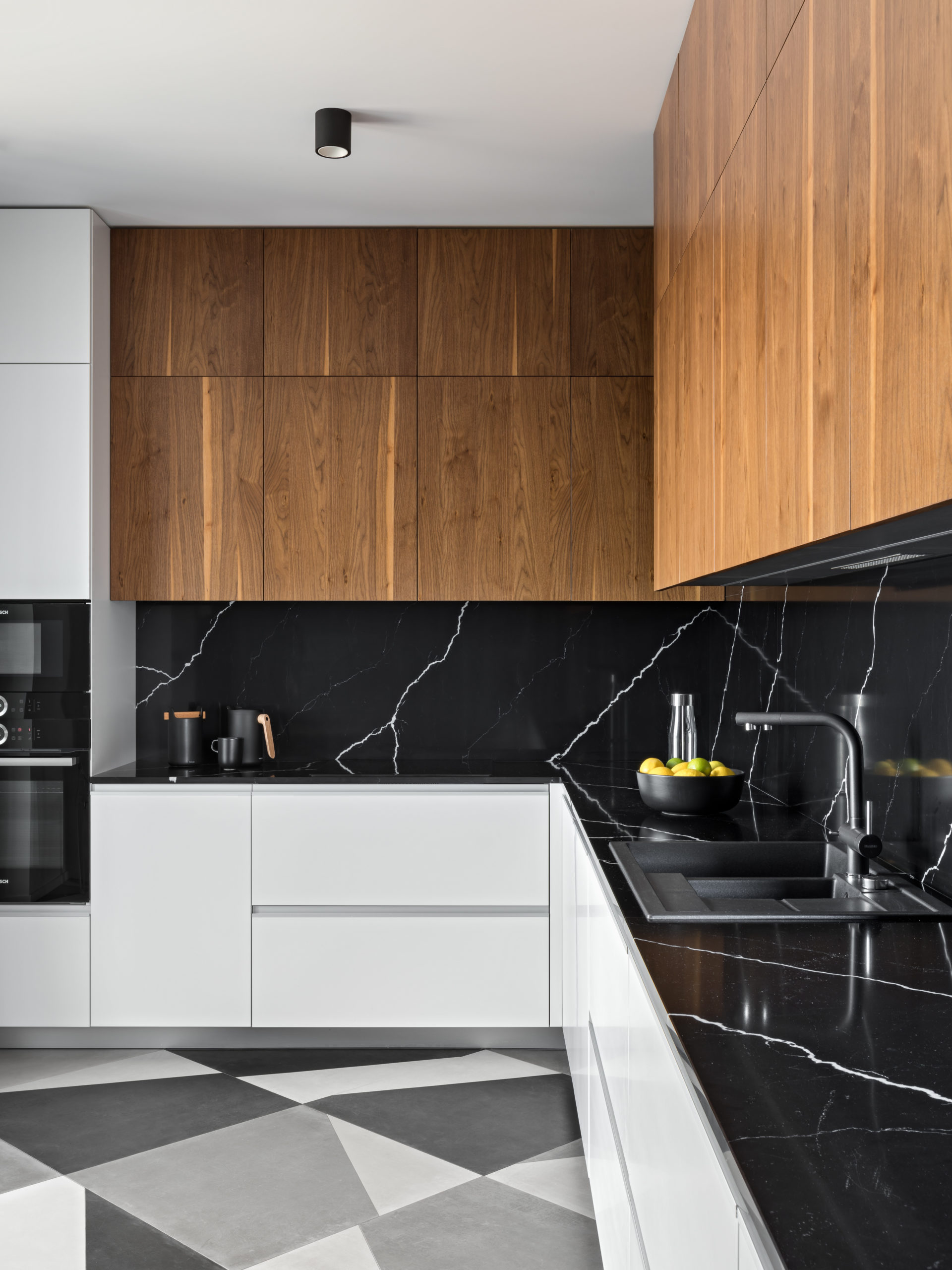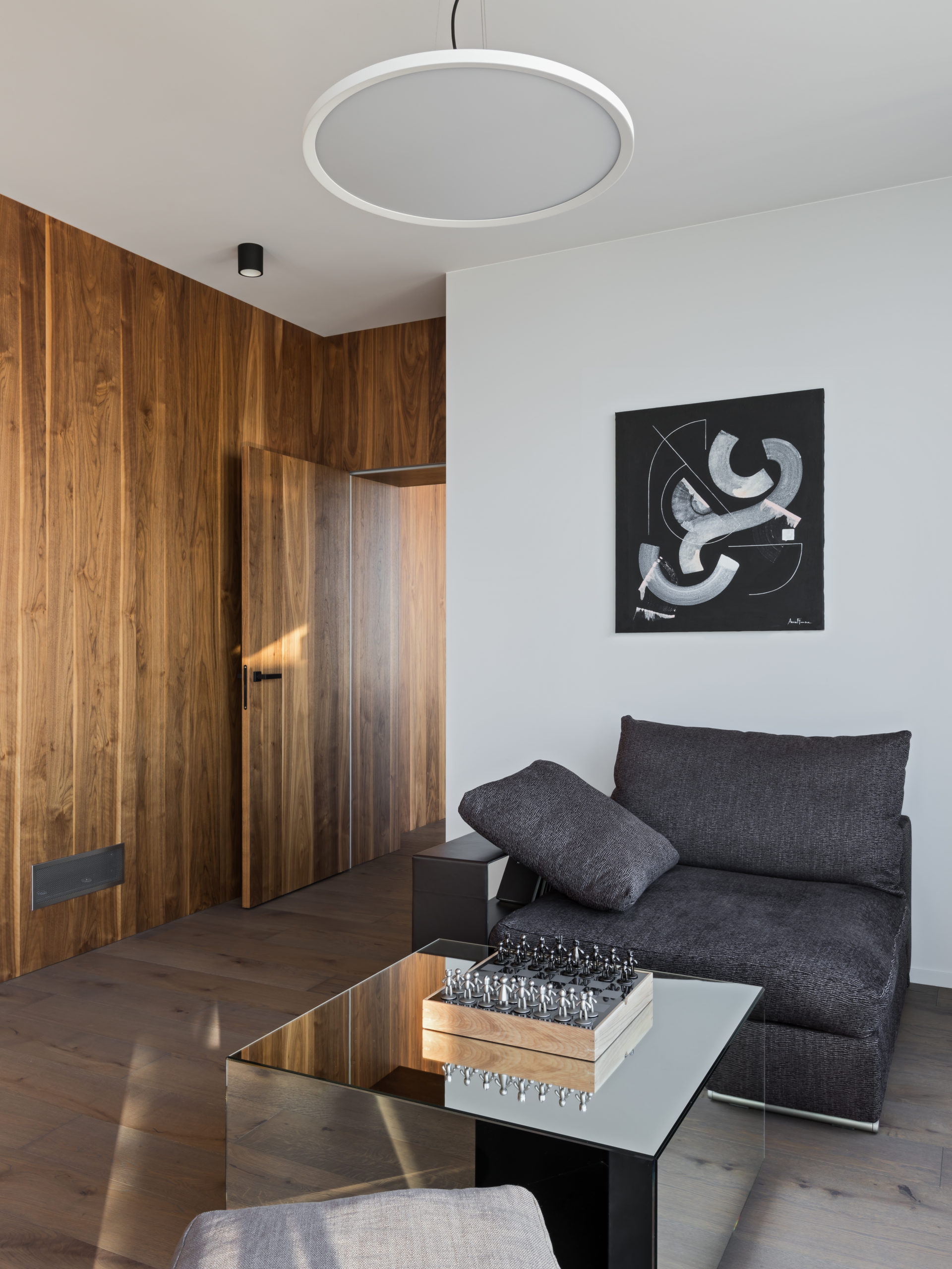 Первый уровень отведен под общественную зону с просторной гостиной, кухней-столовой и большой гардеробной, объединенную акцентным мозаичным полом. Приватную зону со спальней, игровой комнатой и кабинетом разместили на втором этаже. Паркетный пол в ансамбле со шпонированными панелями и фасадами придает пространству необходимую камерность и уют.