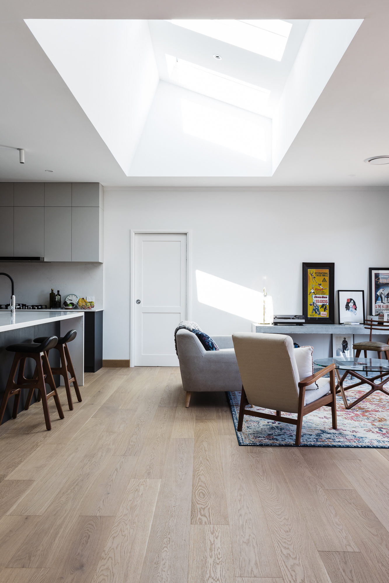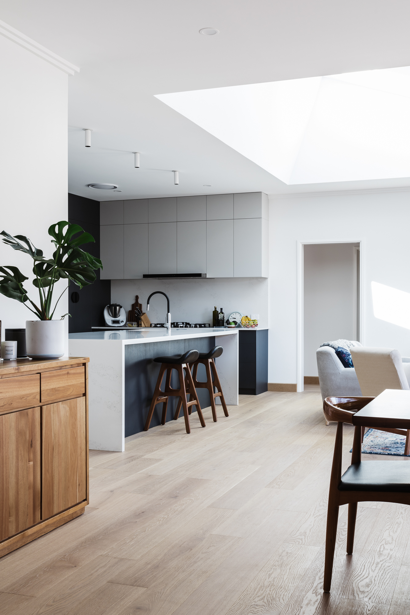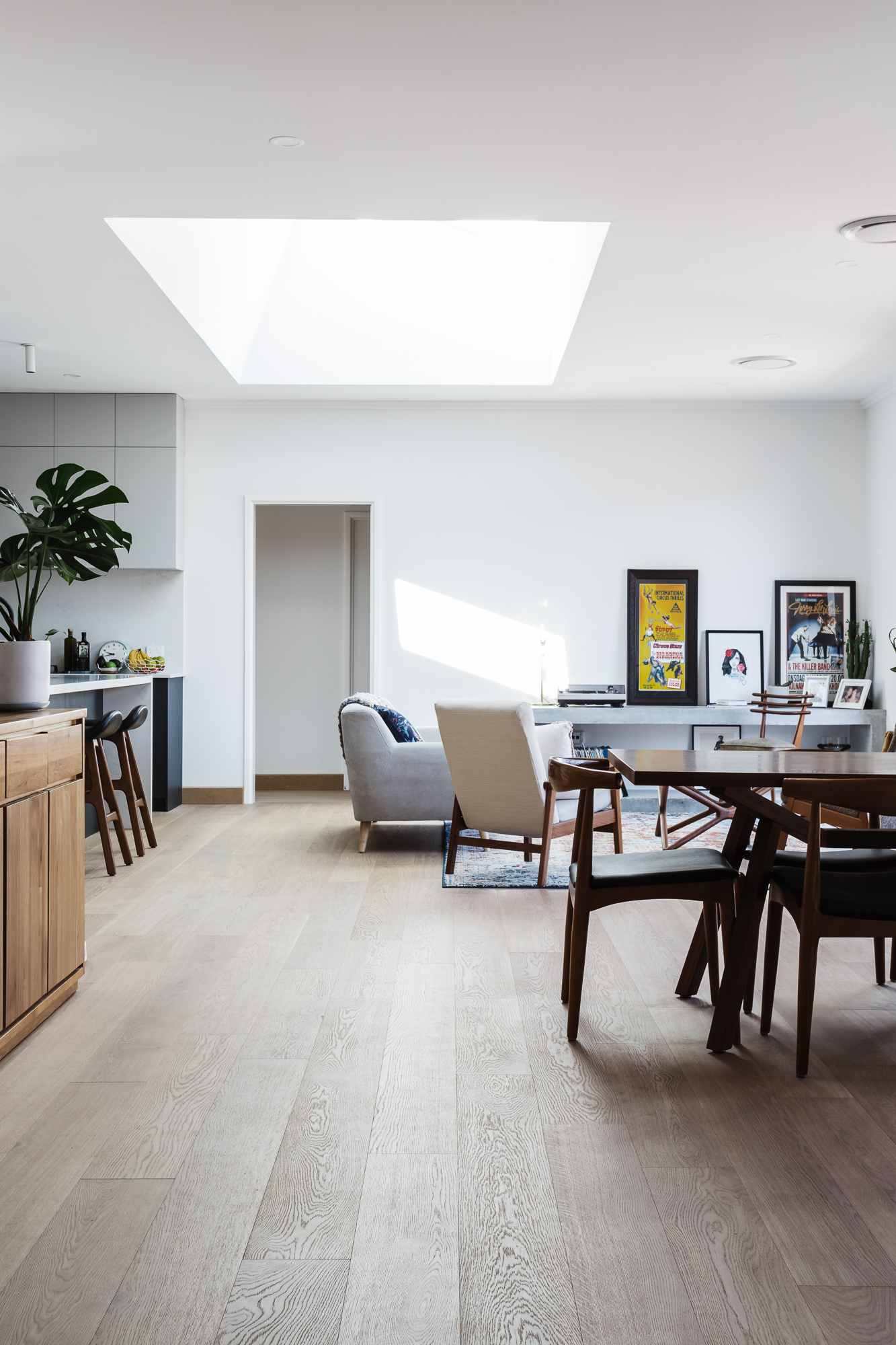 99-Poynter-Drive-Duncraig_web-44Удивительно гармоничный интерьер от нашего австралийского партнера Woodpecker Flooring. Все построено на игре контрастов – цвета, материалов, стилей, освещения. Холодный камень – и натуральное дерево. Белые, дающие прохладу стены – и естественный теплый оттенок дубового паркета, который смягчает черно-белый контраст в отделке кухни. Строгая, лаконичная кухонная зона – и эклектичная, комфортная зона гостиной.