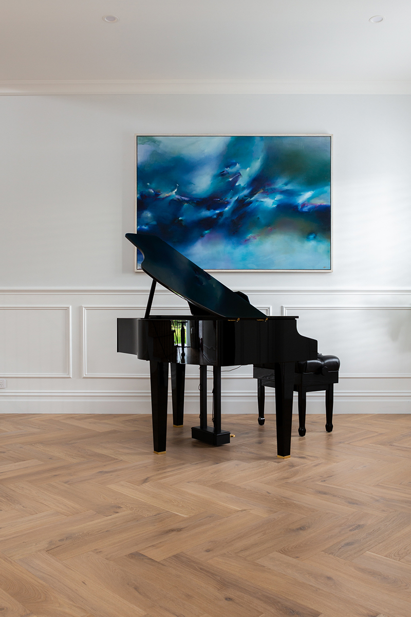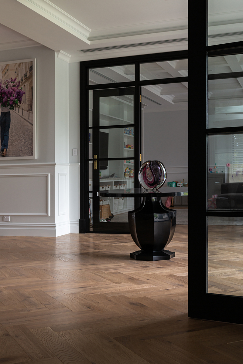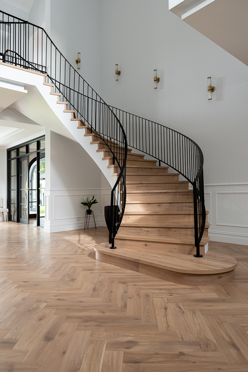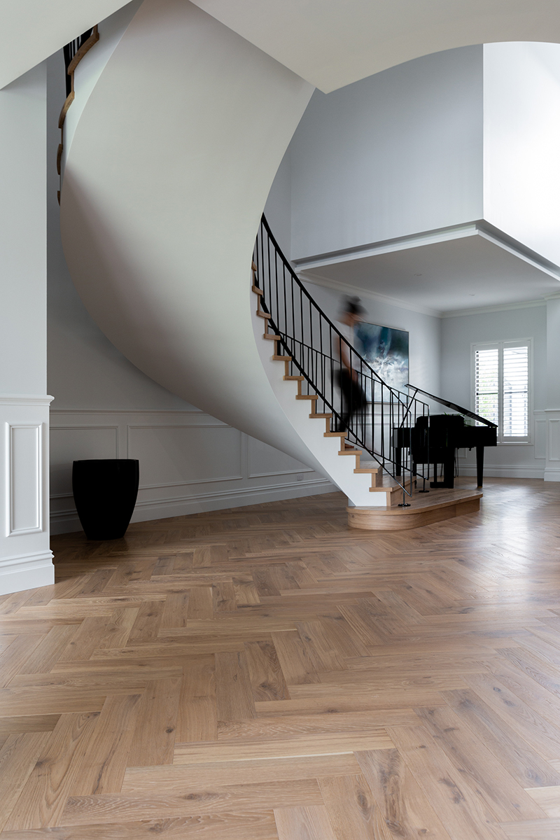 4-Coswick-oak-T&G-tavern-GingerСовременный минималистичный интерьер частного дома в городе Перте в Западной Австралии. Функциональная мебель, минимум предметов и ненавязчивый декор аккуратно обрамлены элементами современной классики – от плавных линий элегантной лестницы и молдингов на стенах до английской елки на полу. Сочный имбирный оттенок паркета смягчает графичный контраст черного и белого в интерьере и создает атмосферу обжитого дома – просторного и спокойного. Напольное покрытие и лестничные ступени – паркет Coswick.