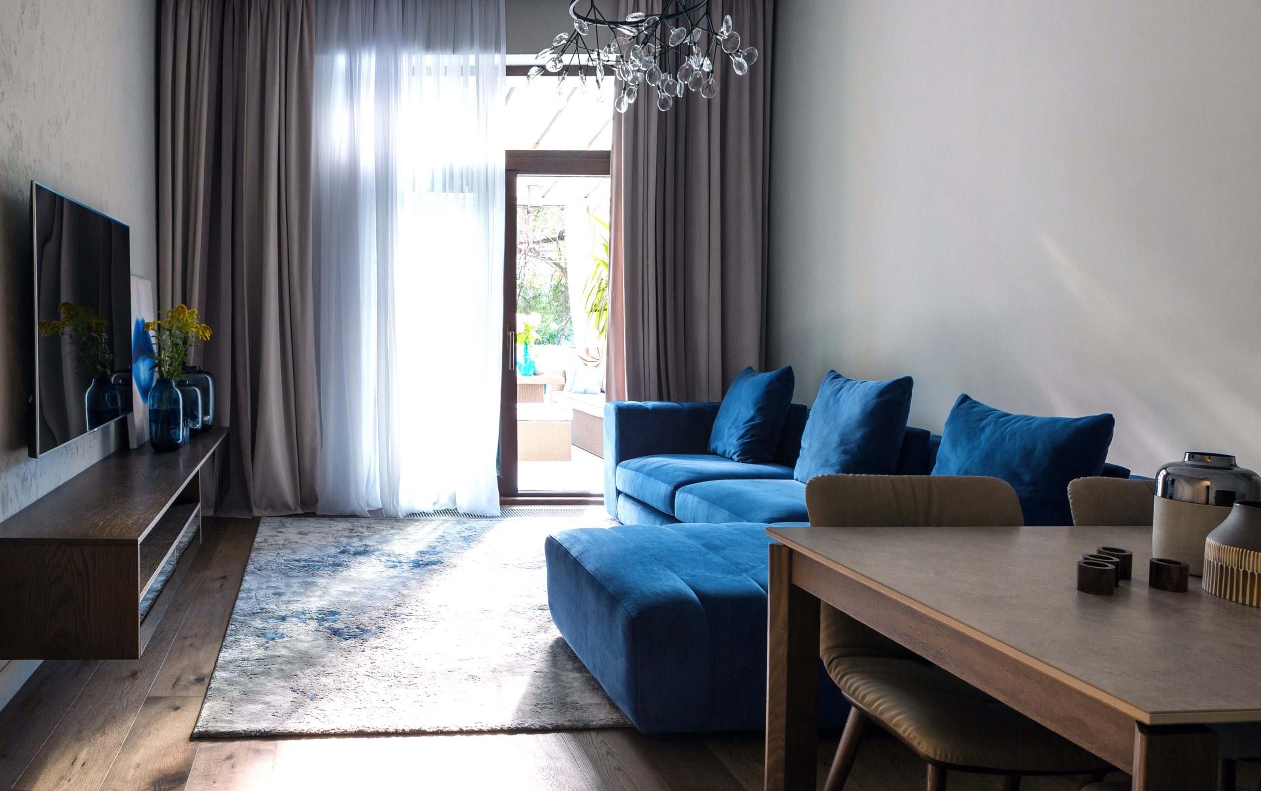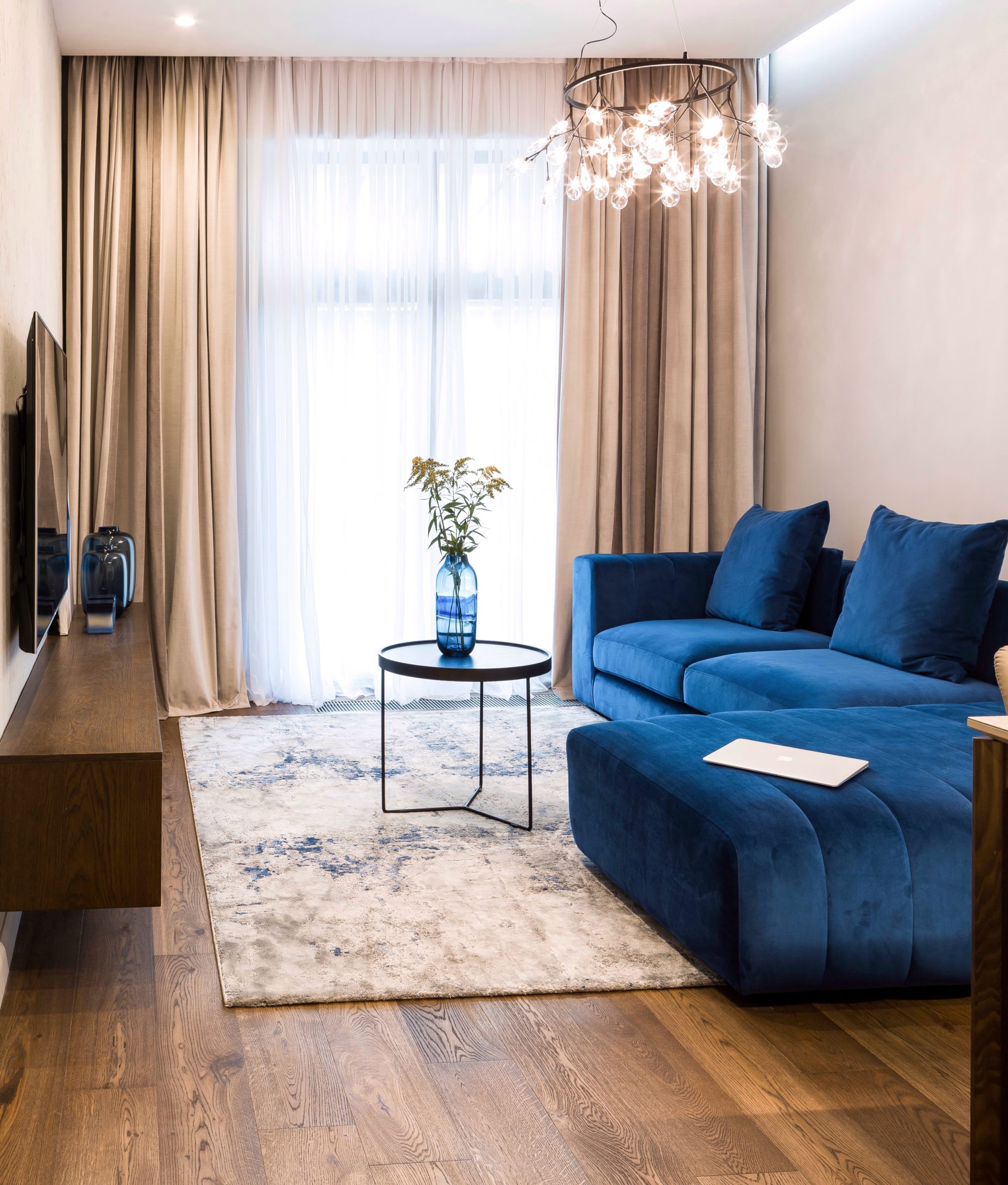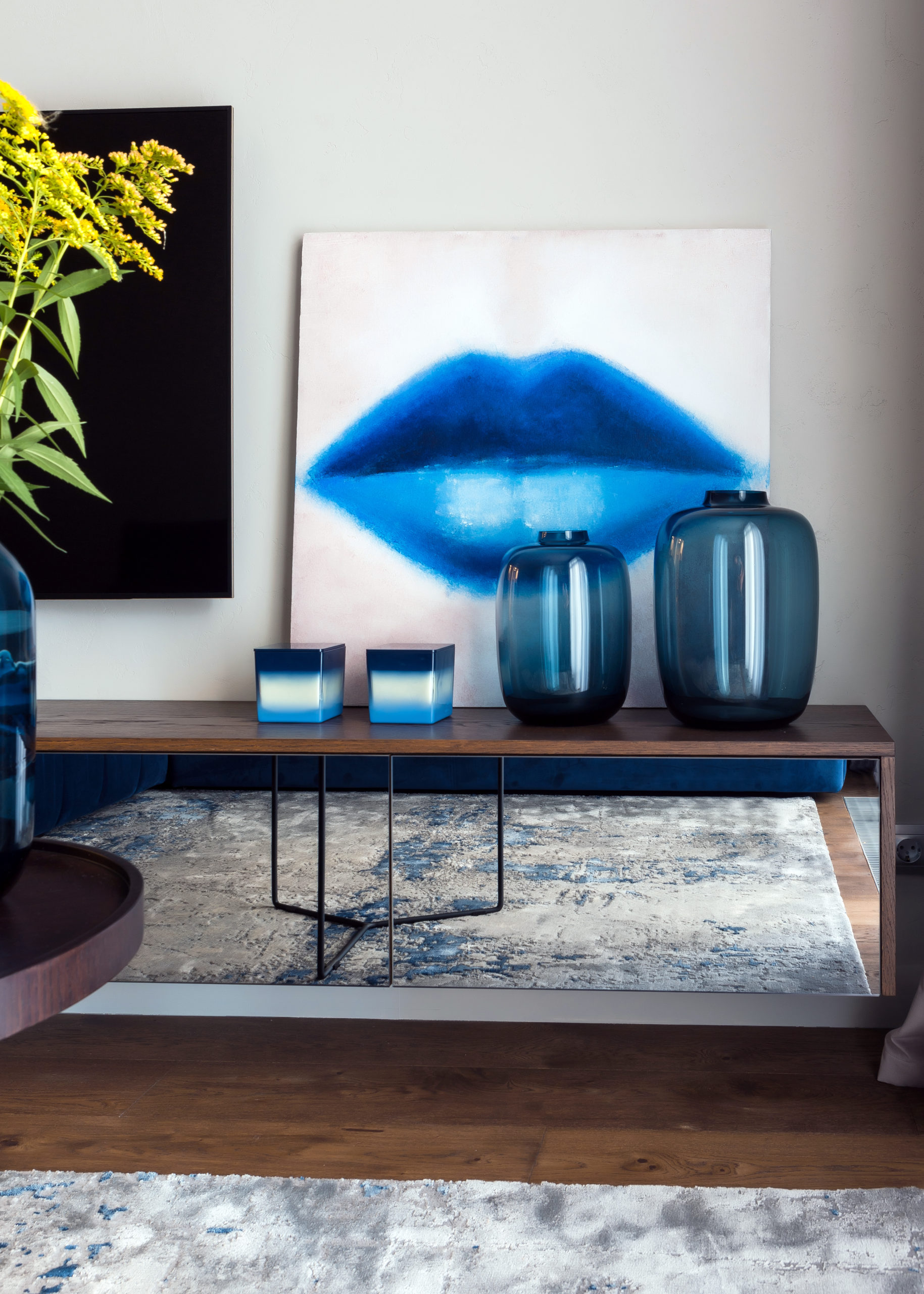 В качестве основного цветового акцента на фоне нейтральных оттенков стен и текстиля она выбрала глубокий синий.