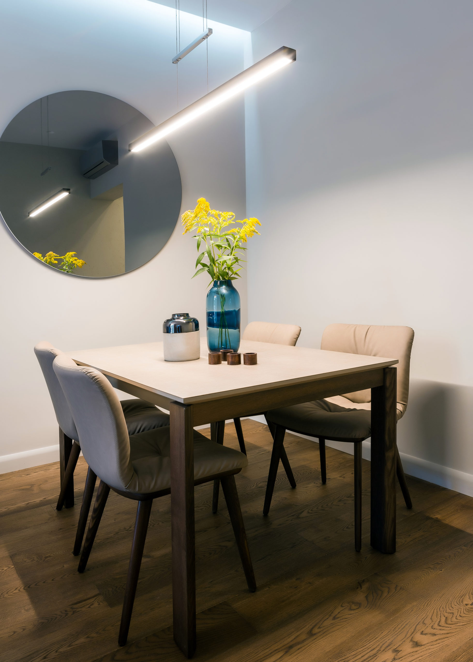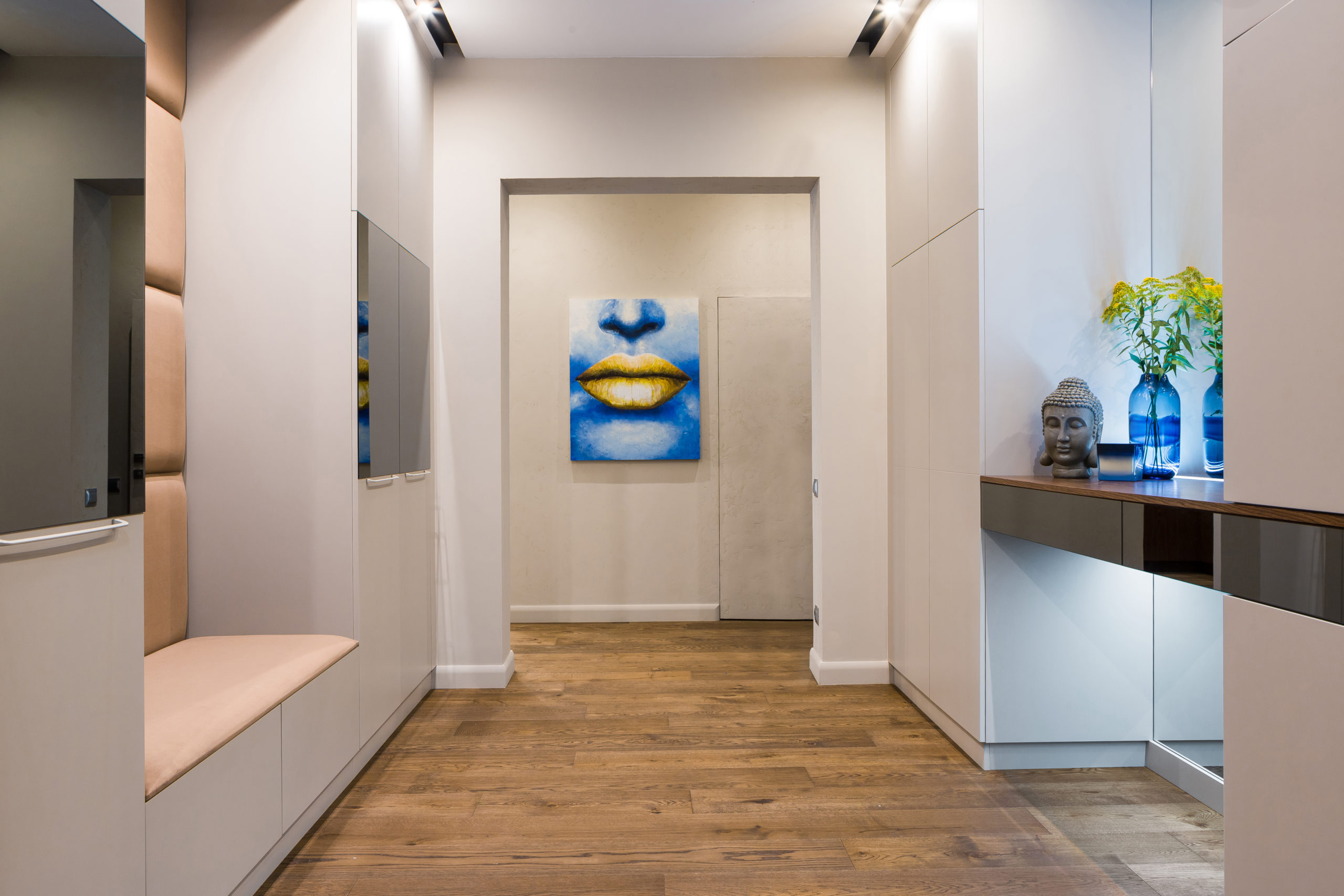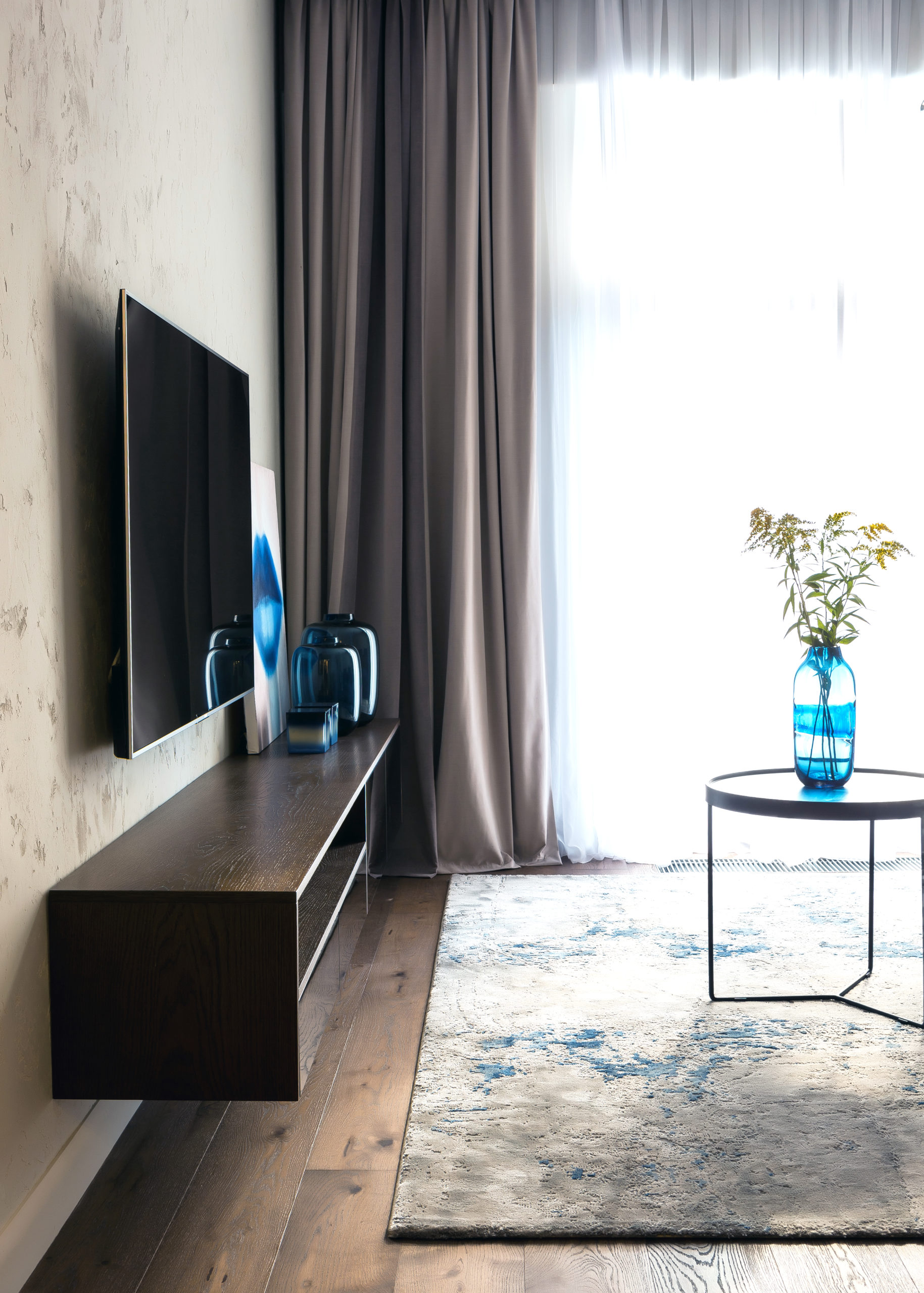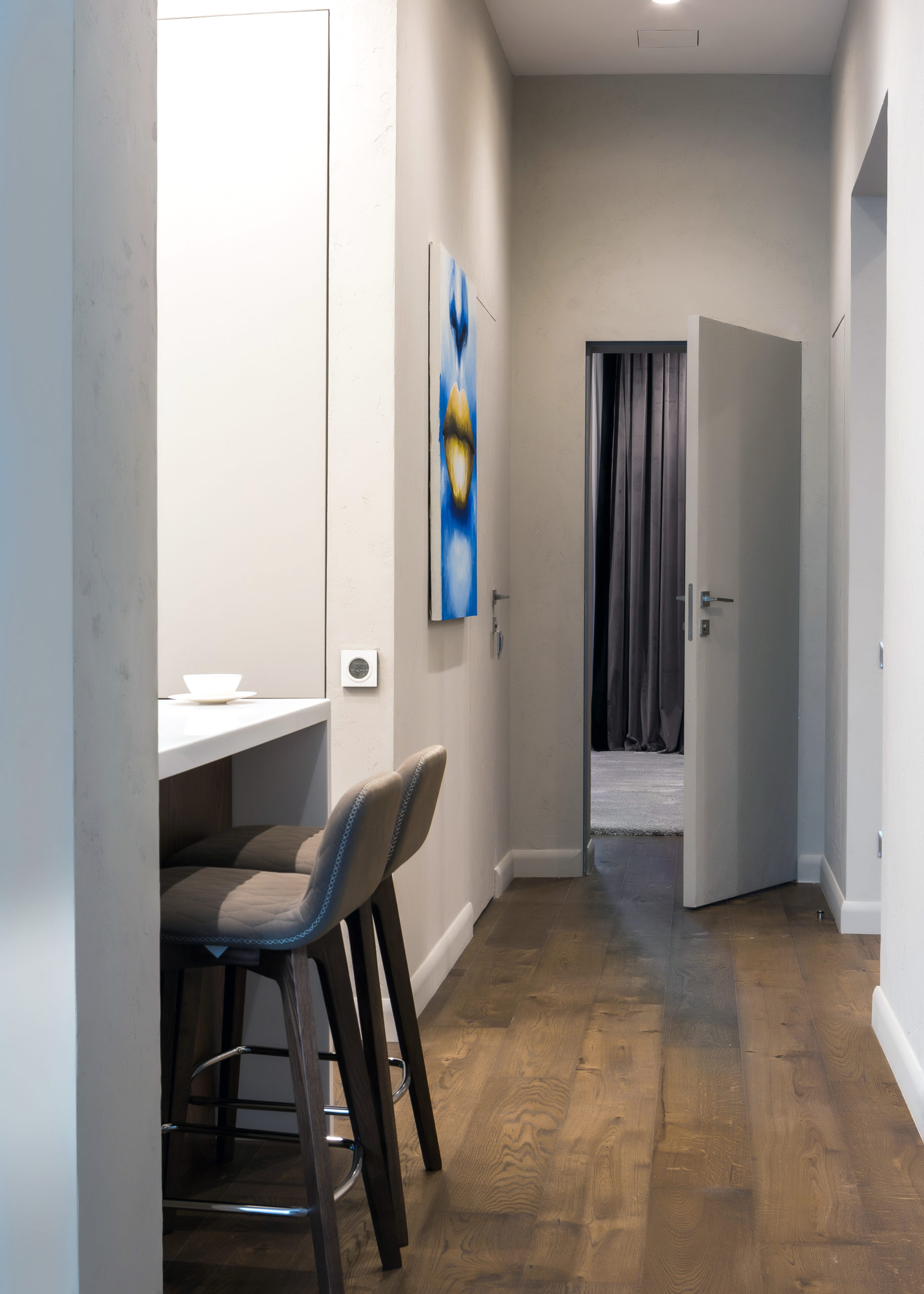 Сбалансированный, уравновешенный интерьер для молодого, уверенного в себе мужчины, который точно знает, чего хочет. Приступая к работе с дизайнером Данарой Ахметовой, он сформулировал свои пожелания: достаточные количество мест хранения, спокойные нейтральные тона, использование велюра и тактильно приятных текстур, а также паркетная доска на полу. В остальном доверился дизайнеру – вплоть до выбора картин и декора.