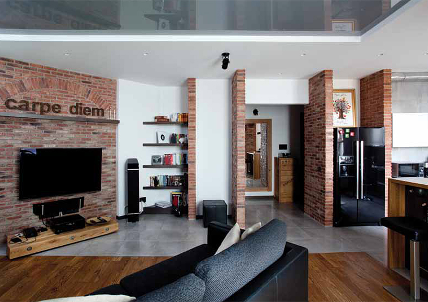 Кирпичная кладка, серые стены, незакрытая труба вытяжки, кухонная плитка, имитирующая бетон, металлический фасад барной стойки – все эти элементы промышленной эстетики делают квартиру жильем с характером, здесь чувствуется дух молодости, смелости и творчества.