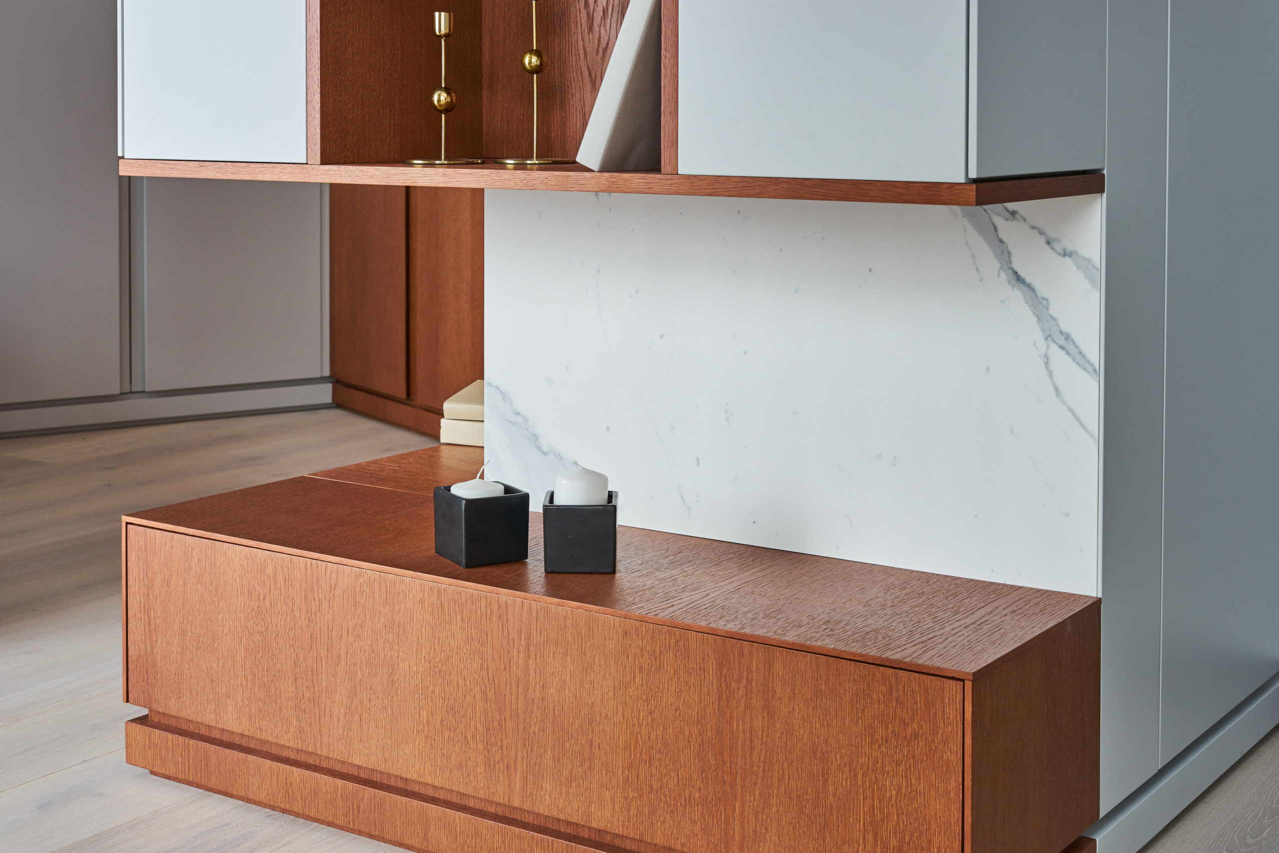 Основными критериями при выборе мебели и отделочных материалов являлись высокое качество, экологичность, надежность и долговечность. Вся мебель произведена по эскизам дизайнера. Нейтральный светло-серый цвет стен и фасадов мебели выгодно подчеркивается выразительным цветом шпона дуба и оттенками охры в текстиле. Дополняет это сочетание светлый, но теплый оттенок пола, для которого выбрали паркетную доску Coswick.