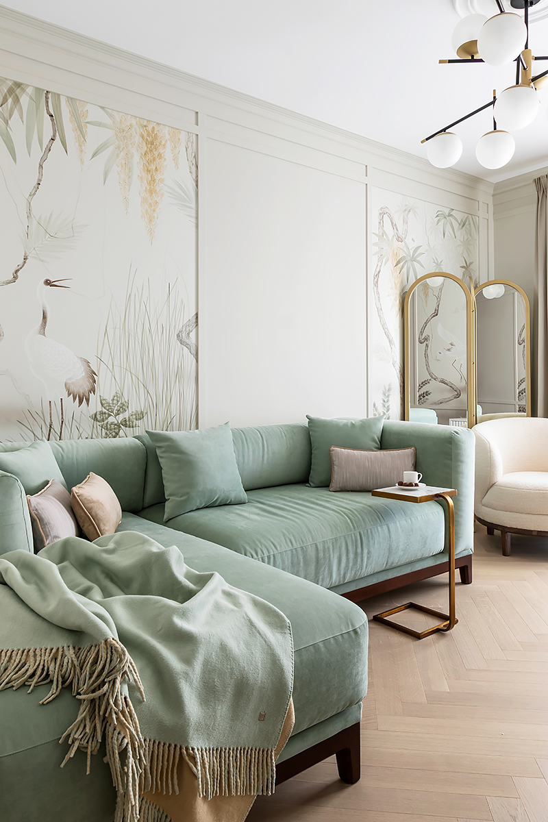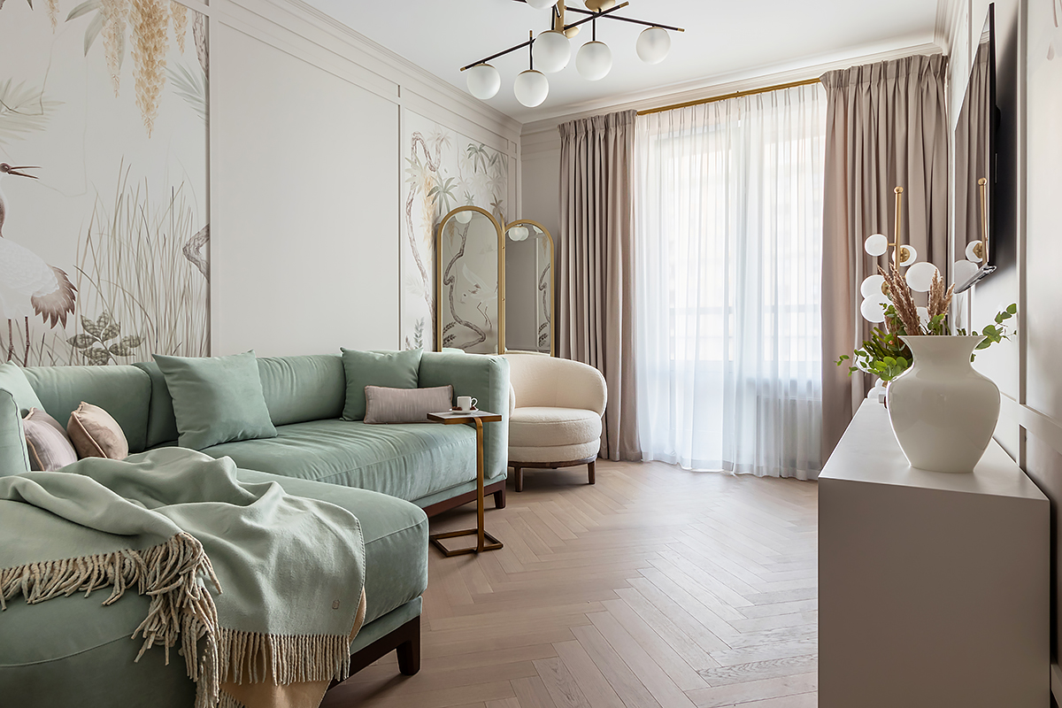 – Одним из первых в проект был выбран паркет. Я, как поклонник цветовой гаммы Coswick, представляла в интерьере именно его. И оттенки Серого Дэви в английской елочке влюбили в себя с первого взгляда.
