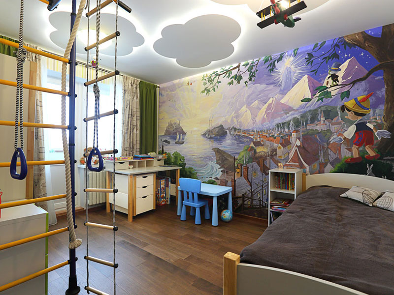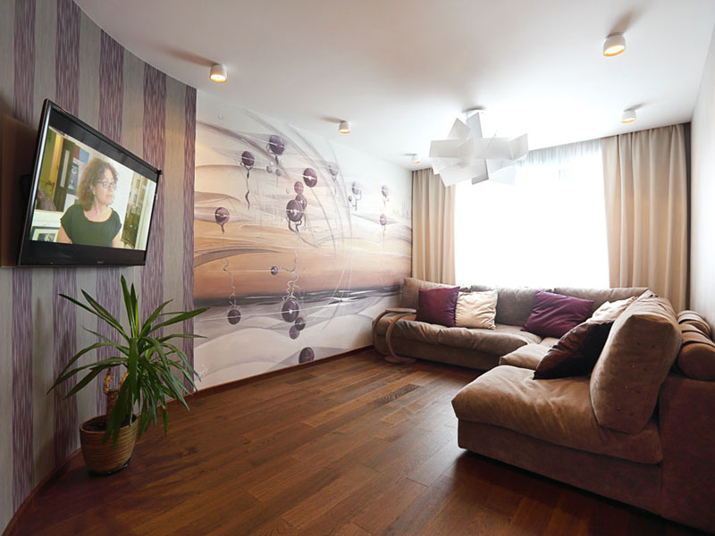 Но, безусловно, главным приемом для визуального увеличения пространства стало художественное оформление стен в различных техниках. В прихожей нас встречают фотообои с видом парижской улочки. Гостиную украшает роспись с футуристическим пейзажем, а детскую – со сказочным. Специально для кухни изготовлено белоснежное 3D-панно. Выбранный декор дает дополнительную перспективу и рождает интересный эффект окна в параллельный мир. Чтобы интерьер не разваливался на отдельные части, в каждом помещении использованы похожие цветовые гаммы, в которых основными являются коричневый и фиолетовый. Завершает визуальное объединение жилища одинаковое напольное покрытие из паркетной доски Косвик.