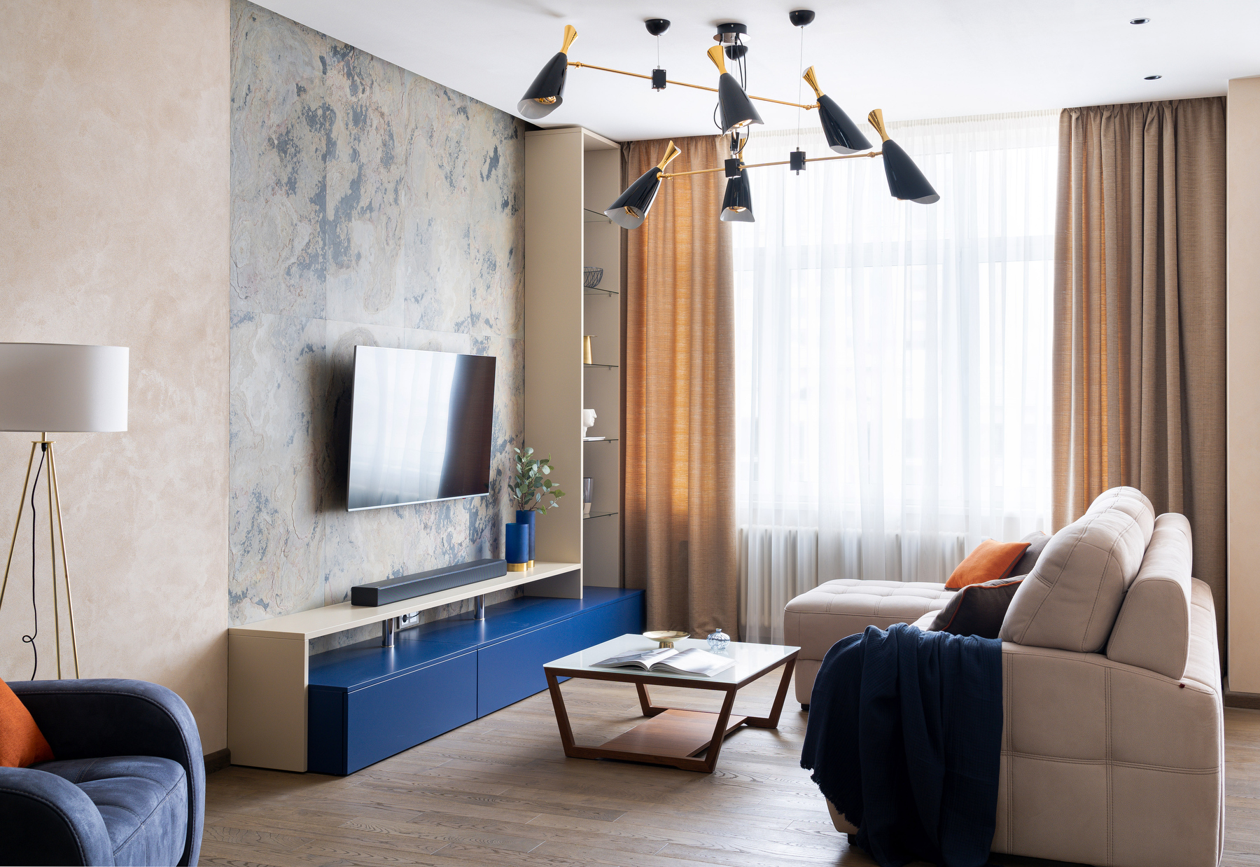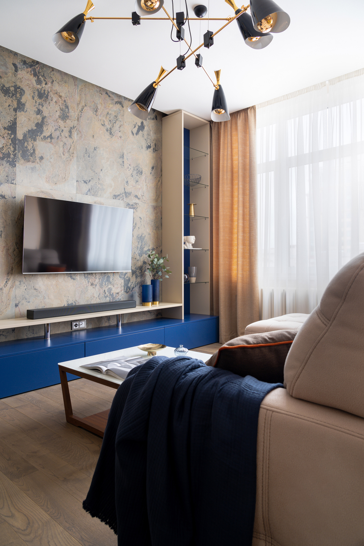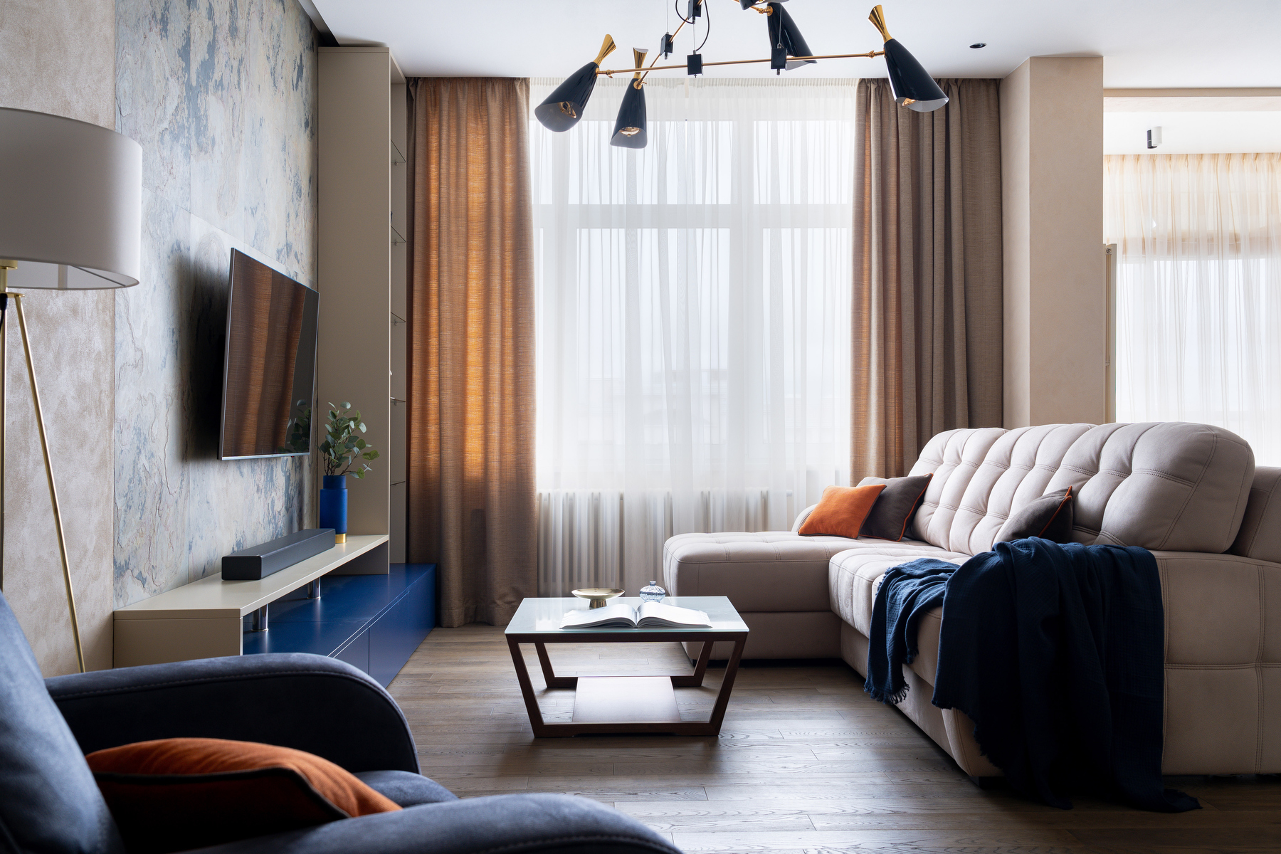 Интерьер квартиры площадью 106 кв.м в ЖК «Московский квартал» города Санкт-Петербурга. Главной задачей дизайнера было создание уютного и функционального пространства с единой цветовой гаммой во всех комнатах. За основу взяли теплые песочные оттенки, а в качестве акцента – насыщенный и свежий синий цвет, который, словно вода, перетекает из одной комнаты в другую.