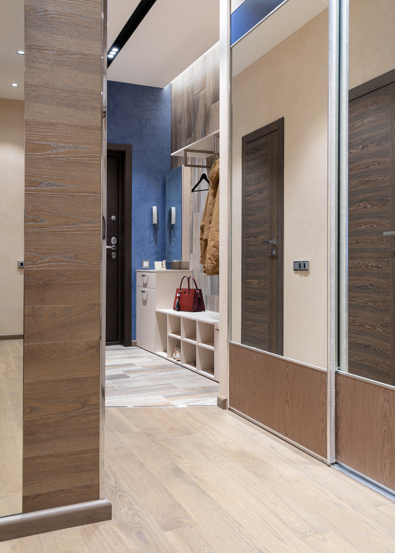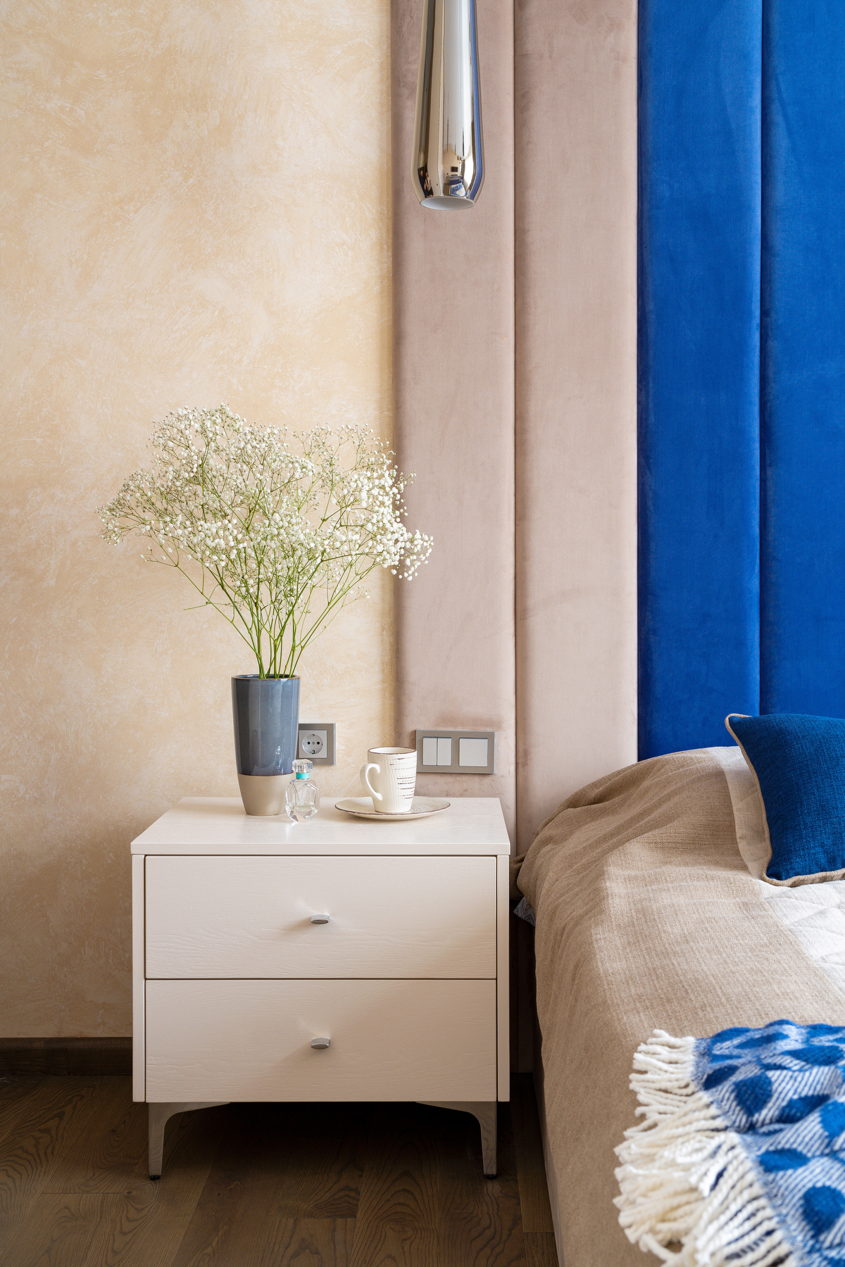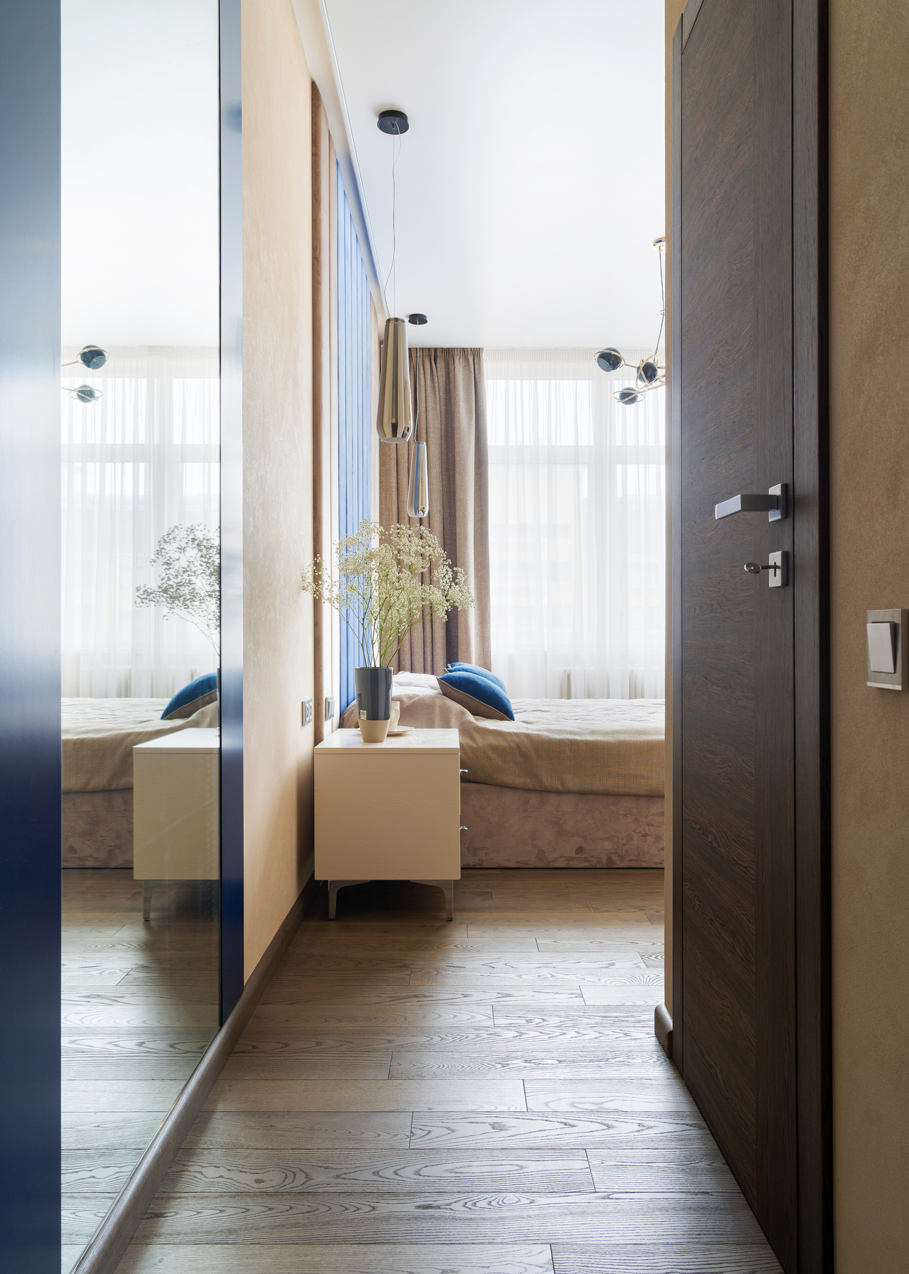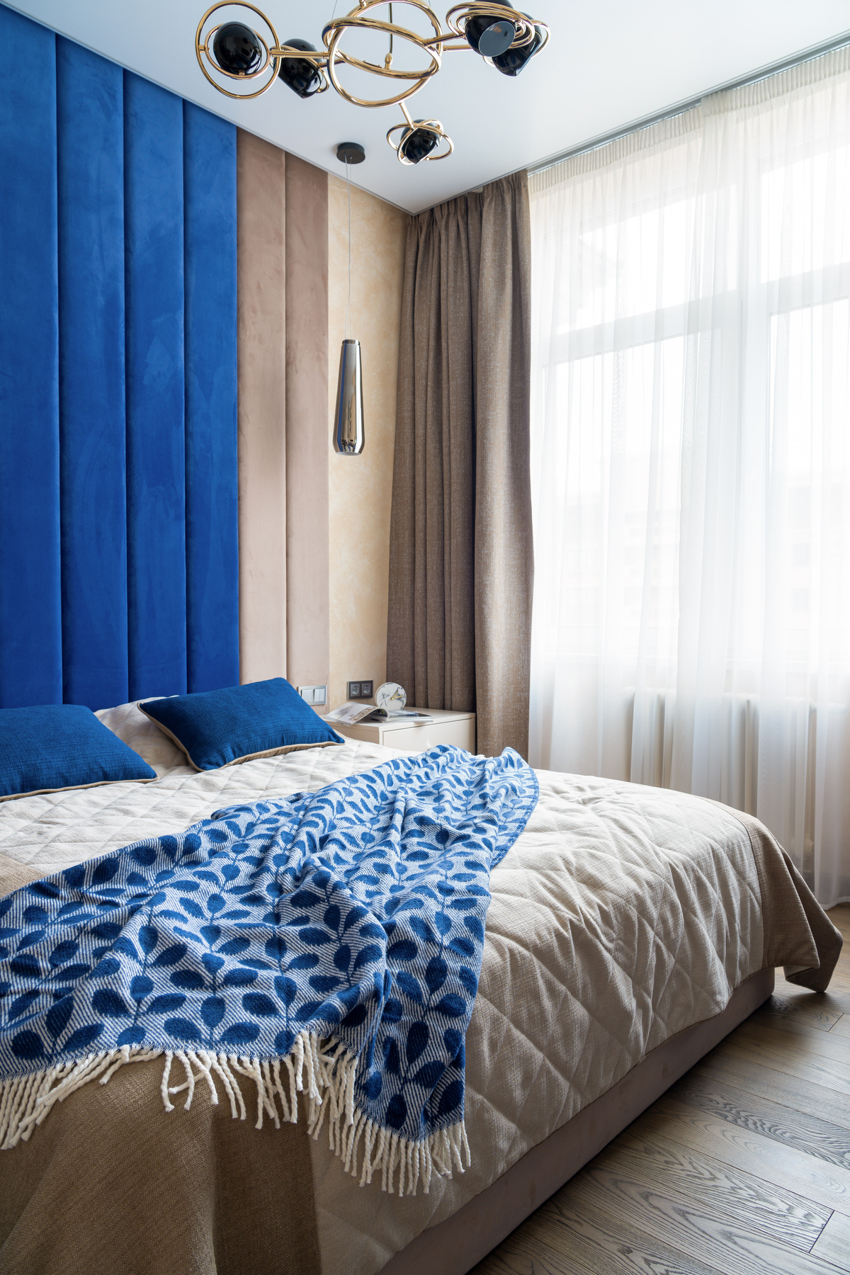 Интерьер квартиры площадью 106 кв.м в ЖК «Московский квартал» города Санкт-Петербурга. Главной задачей дизайнера было создание уютного и функционального пространства с единой цветовой гаммой во всех комнатах. За основу взяли теплые песочные оттенки, а в качестве акцента – насыщенный и свежий синий цвет, который, словно вода, перетекает из одной комнаты в другую.