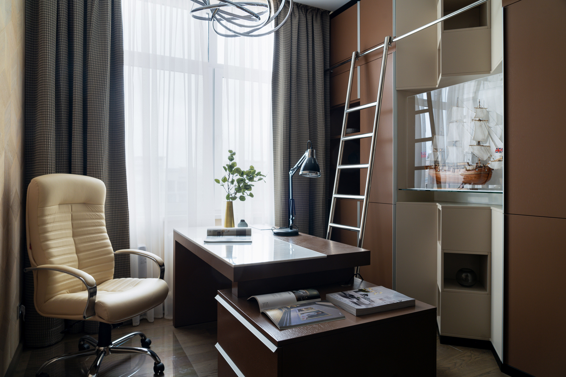 Сердцем квартиры, конечно, является светлая и просторная кухня-гостиная с большим угловым диваном в качестве зонирующего элемента. Кабинет оформлен более сдержанно и строго, в соответствии со своим функциональным назначением. Главный герой здесь – любимый парусник хозяина, для которого выделили большую полку с подсветкой в стеллаже необычной формы.