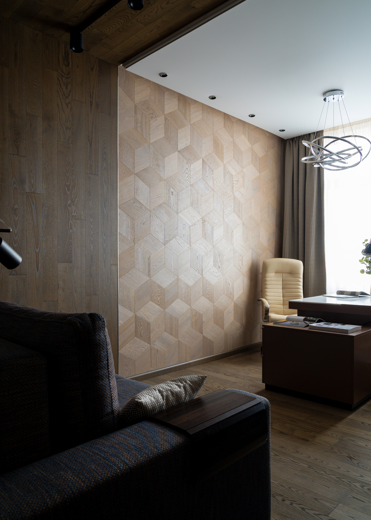 В проекте использован паркет Coswick: паркетная доска из ясеня в цвете Французская Ривьера и паркетри «Ромб» из дуба в цвете Пастель.