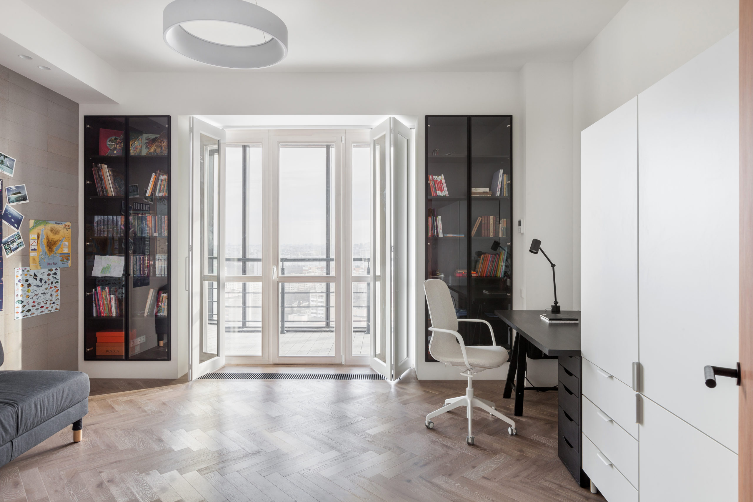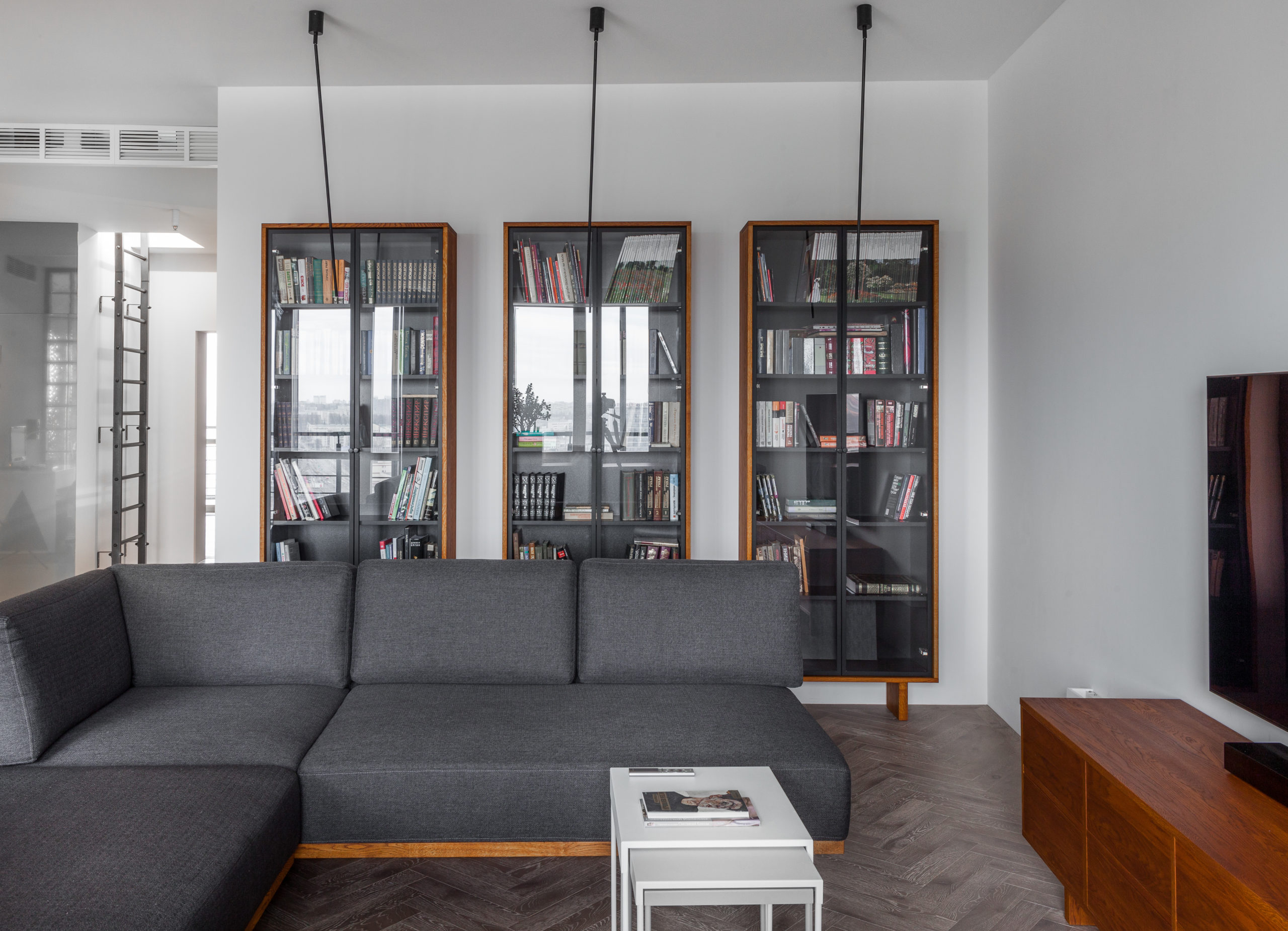 Монохромную гамму интерьера, в которой преобладают белый, серый и акцентный черный цвета, оживляют яркие детали из натурального дерева. Спокойная минималистичная отделка стен помогает фокусировать внимание на мебели, созданной специально для этого проекта. Единство отделки мебели дает ощущение целостности пространства. А классический дубовый паркет в мягком бархатистом цвете «Серый кашемир» добавляет уюта.