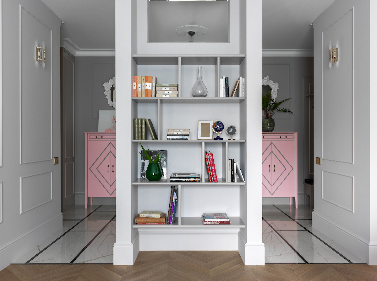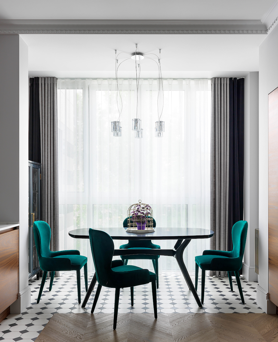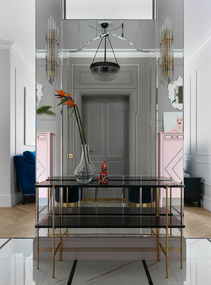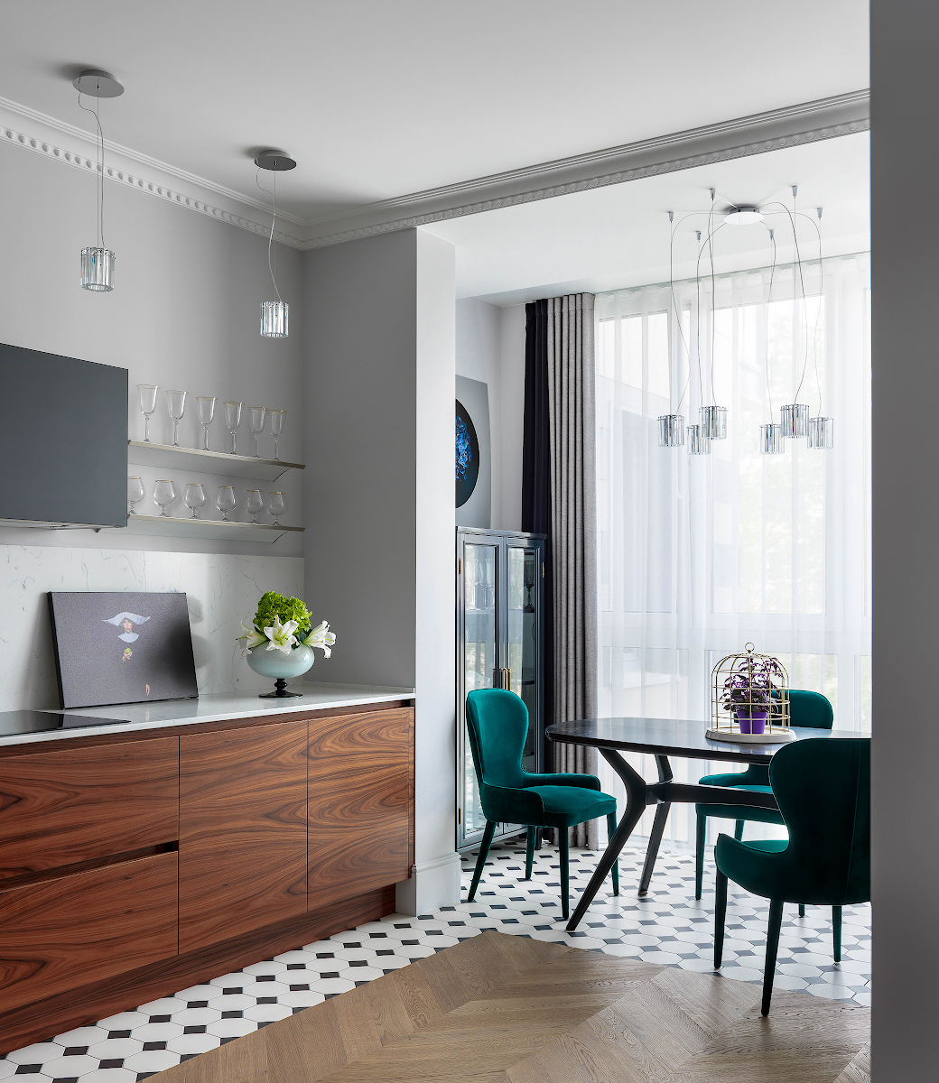 Автору хотелось создать непреходящий интерьер вне времени — timeless. «Основной задачей было смешать, перепутать стили и ощущения. Здесь считывается стилистика французского ампира, некоторые формы и решения продиктовала мода на послевоенный модернизм. Прошлые века процитированы, переизданы и закодированы новыми цветами и материалами». Так, эффектное панно на полу создано из крупноформатного керамогранита. Подробнее о проекте…