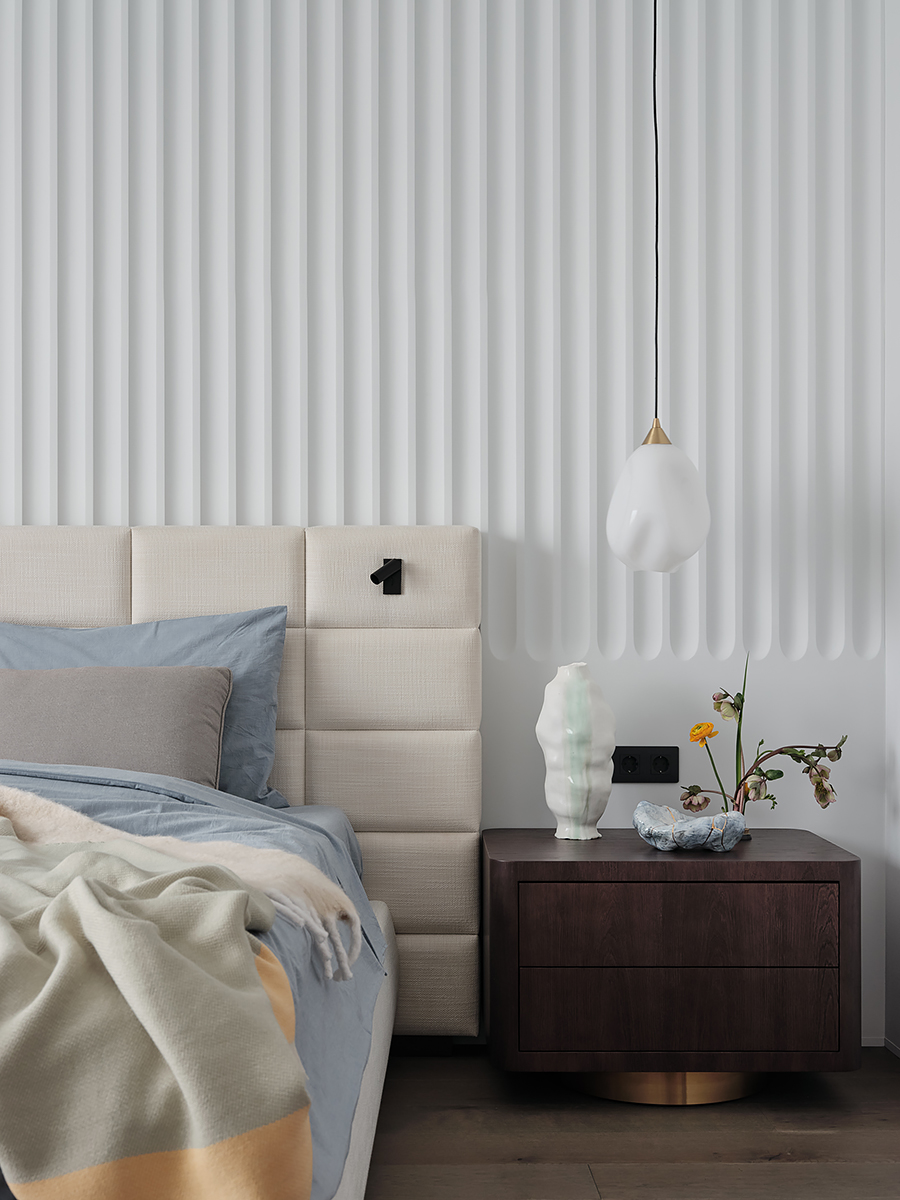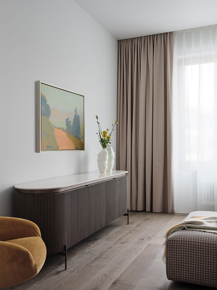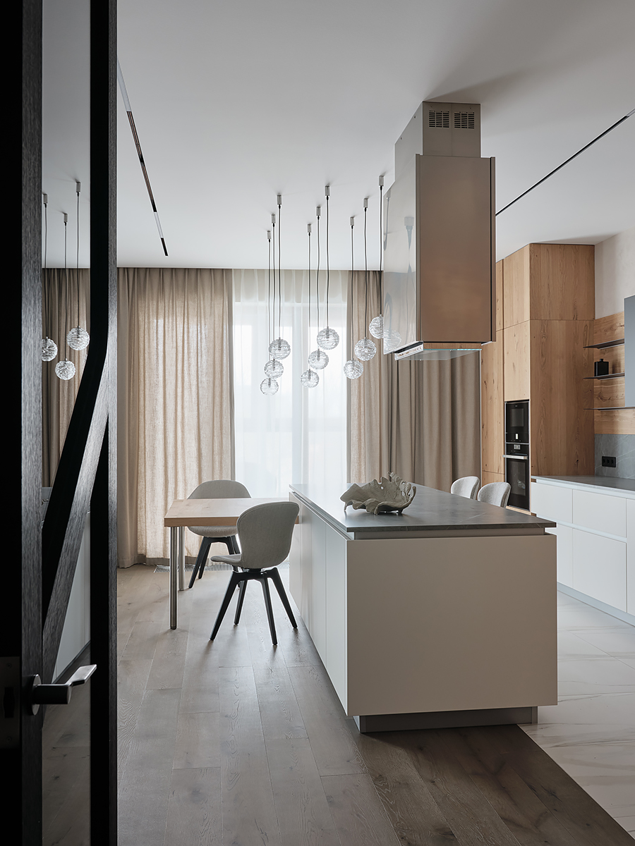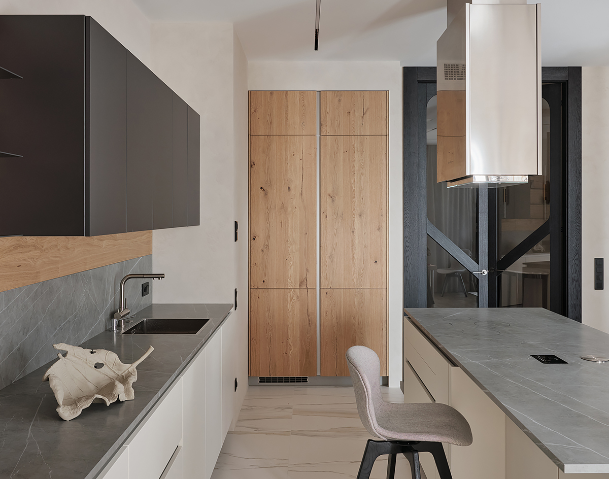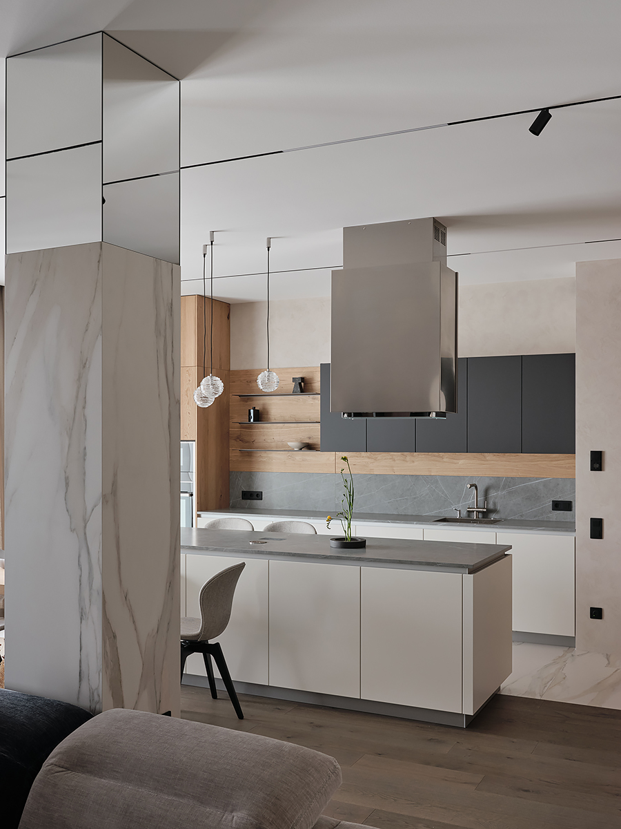 Лаконичное стилистическое решение позволило сохранить максимум пространства, не загромождая его лишними деталями, и в то же время сделать акцент на тщательно продуманных декоративных приемах, символически отсылающих к прошлым эпохам. Например, изготовленная по эскизам дизайнеров дубовая дверь в стиле модерн, ведущая в кухню-гостиную. Или подвесные светильники ручной работы над кухонным островом. Или аллюзия на римский Пантеон в интерьере спальни: стену за изголовьем кровати украшают стилизованные каннелюры, которые повторяются в отделке мебели, а большой круглый светильник на потолке имитирует световой люк в куполе. Или натуральный травертин в отделке душевой – материал, который использовался при строительстве многих исторических зданий Санкт-Петербурга. И, наконец, напольное покрытие из натурального дерева, без чего невозможно представить интерьер с историей.