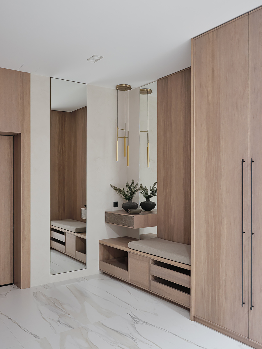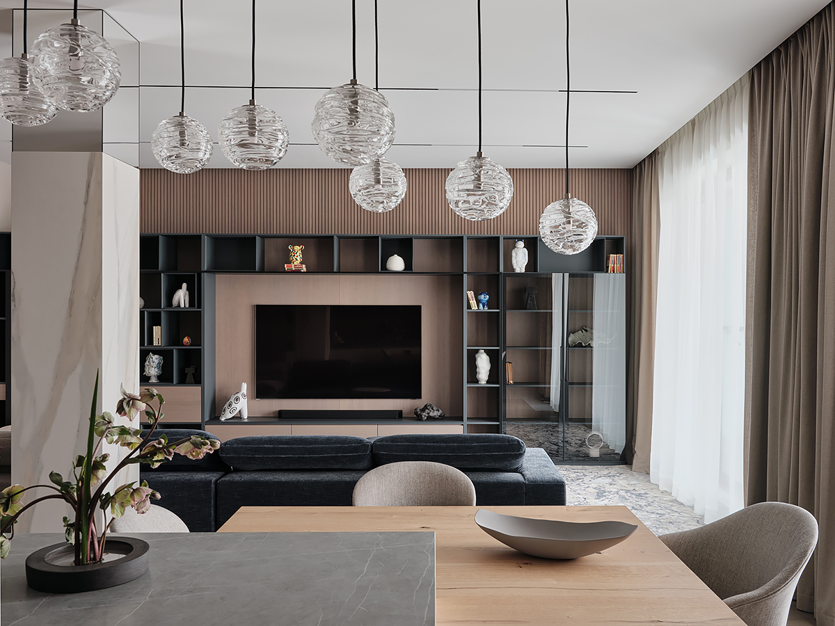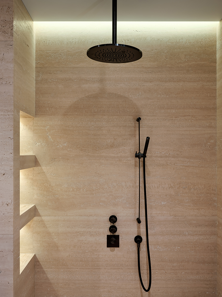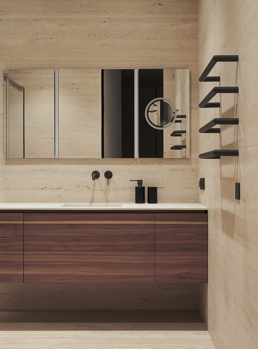 Лаконичное стилистическое решение позволило сохранить максимум пространства, не загромождая его лишними деталями, и в то же время сделать акцент на тщательно продуманных декоративных приемах, символически отсылающих к прошлым эпохам. Например, изготовленная по эскизам дизайнеров дубовая дверь в стиле модерн, ведущая в кухню-гостиную. Или подвесные светильники ручной работы над кухонным островом. Или аллюзия на римский Пантеон в интерьере спальни: стену за изголовьем кровати украшают стилизованные каннелюры, которые повторяются в отделке мебели, а большой круглый светильник на потолке имитирует световой люк в куполе. Или натуральный травертин в отделке душевой – материал, который использовался при строительстве многих исторических зданий Санкт-Петербурга. И, наконец, напольное покрытие из натурального дерева, без чего невозможно представить интерьер с историей.