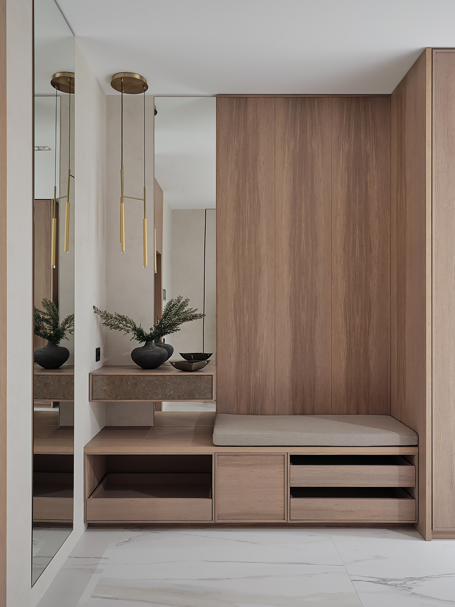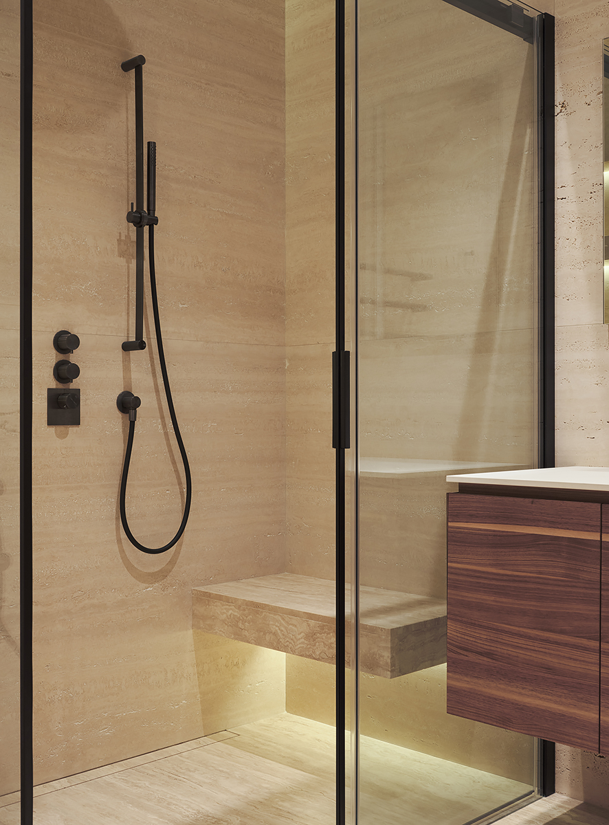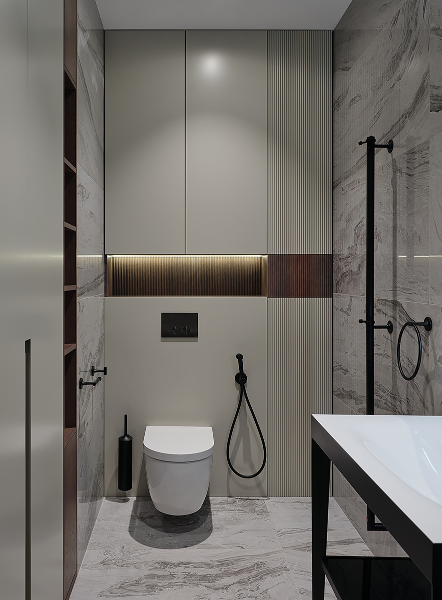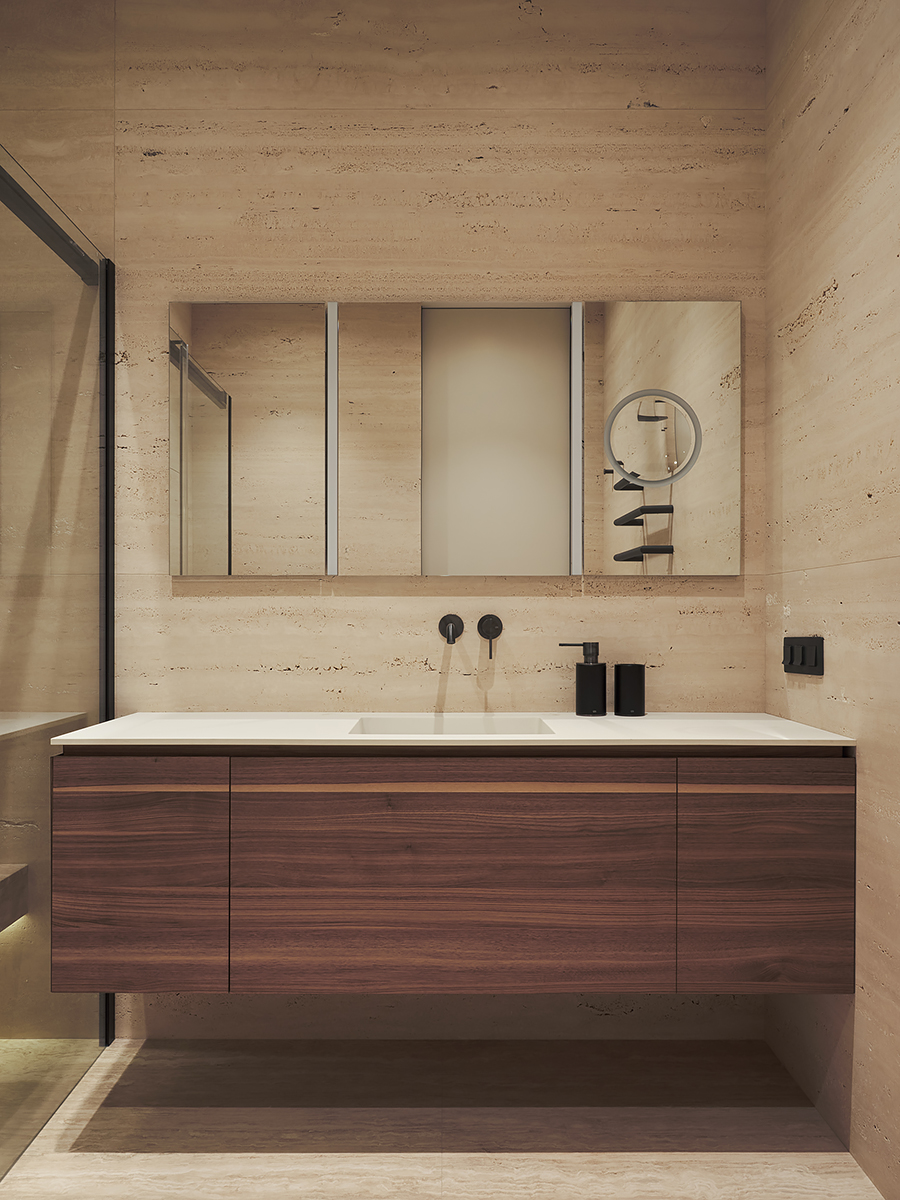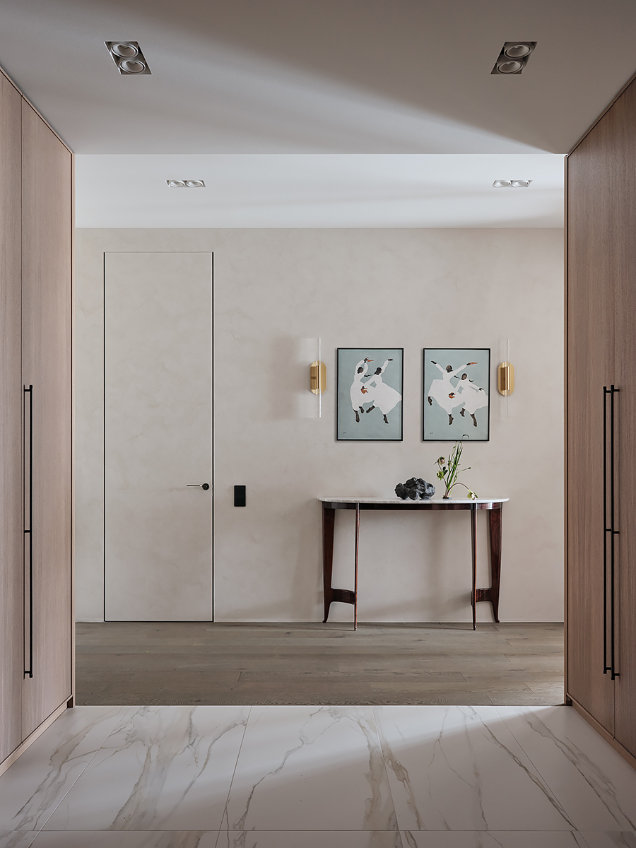Лаконичное стилистическое решение позволило сохранить максимум пространства, не загромождая его лишними деталями, и в то же время сделать акцент на тщательно продуманных декоративных приемах, символически отсылающих к прошлым эпохам. Например, изготовленная по эскизам дизайнеров дубовая дверь в стиле модерн, ведущая в кухню-гостиную. Или подвесные светильники ручной работы над кухонным островом. Или аллюзия на римский Пантеон в интерьере спальни: стену за изголовьем кровати украшают стилизованные каннелюры, которые повторяются в отделке мебели, а большой круглый светильник на потолке имитирует световой люк в куполе. Или натуральный травертин в отделке душевой – материал, который использовался при строительстве многих исторических зданий Санкт-Петербурга. И, наконец, напольное покрытие из натурального дерева, без чего невозможно представить интерьер с историей.
