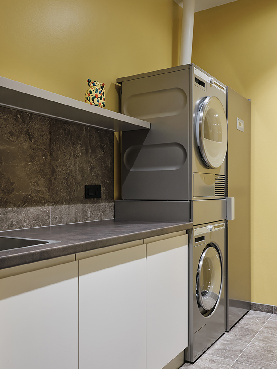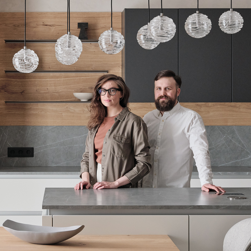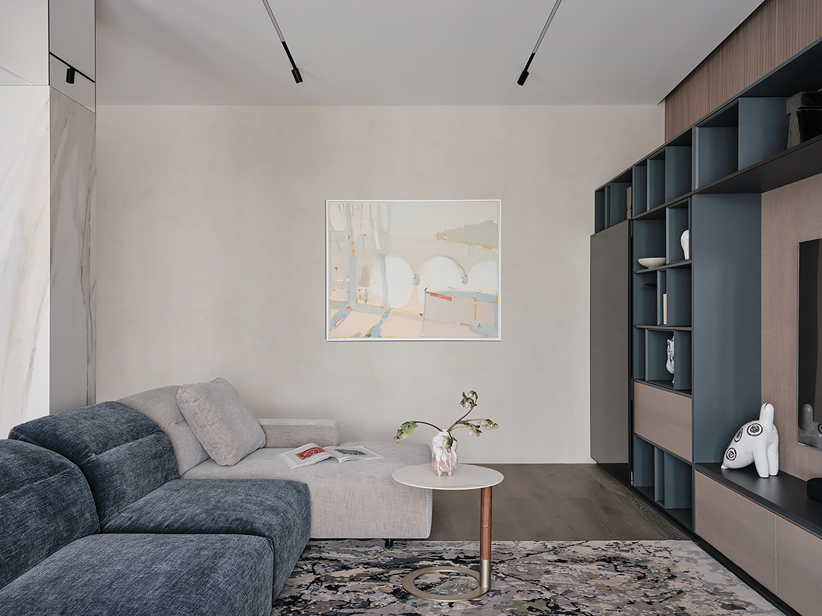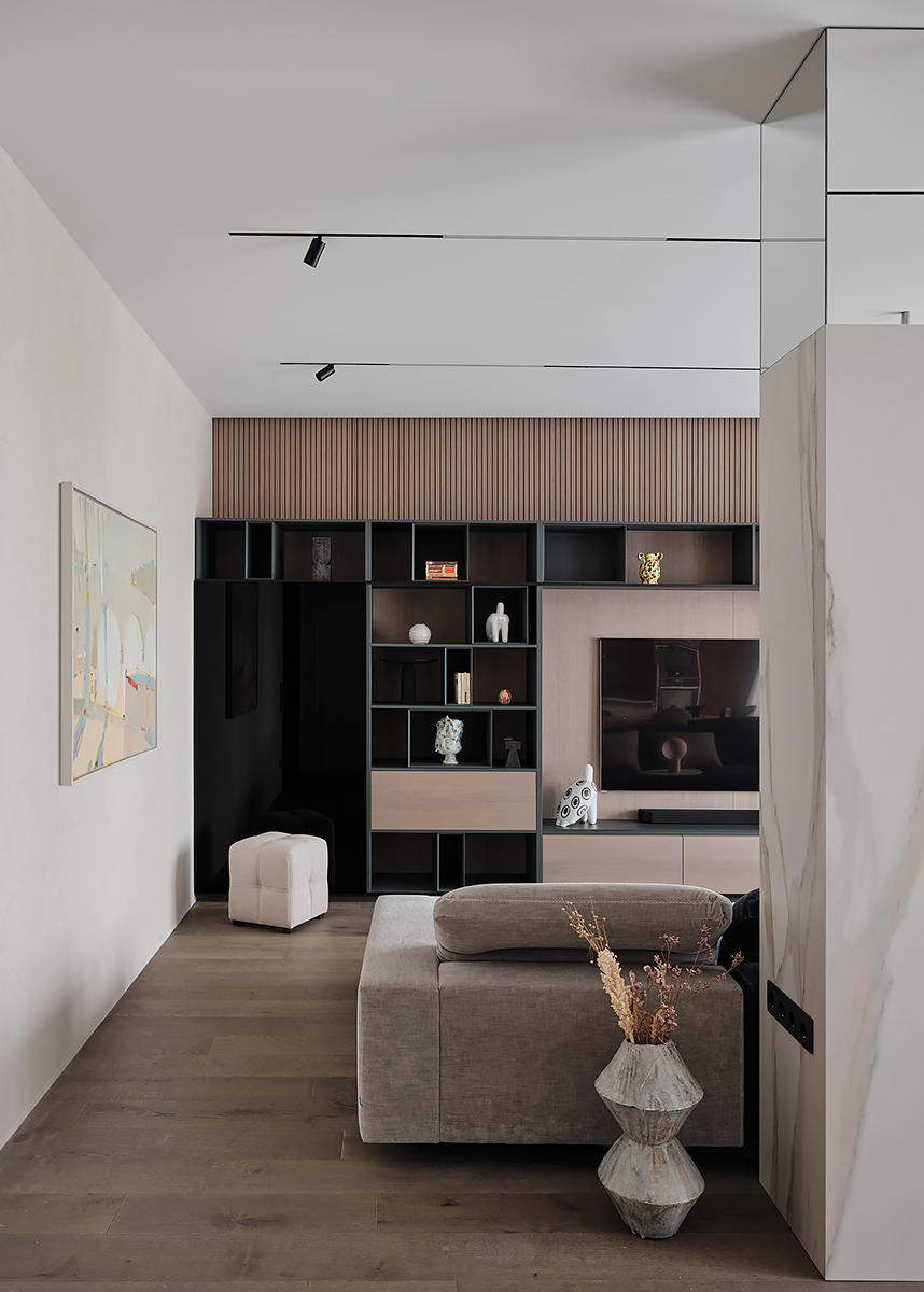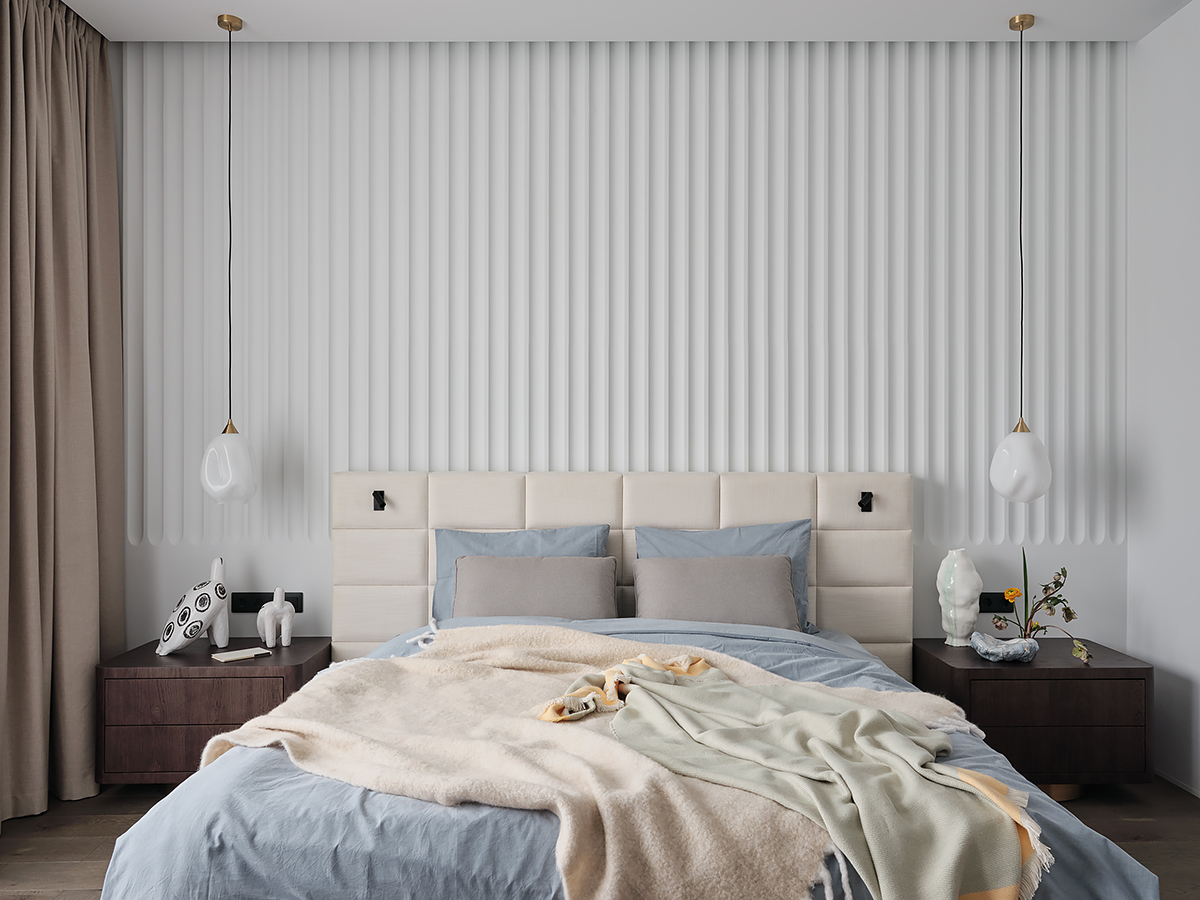 Лаконичное стилистическое решение позволило сохранить максимум пространства, не загромождая его лишними деталями, и в то же время сделать акцент на тщательно продуманных декоративных приемах, символически отсылающих к прошлым эпохам. Например, изготовленная по эскизам дизайнеров дубовая дверь в стиле модерн, ведущая в кухню-гостиную. Или подвесные светильники ручной работы над кухонным островом. Или аллюзия на римский Пантеон в интерьере спальни: стену за изголовьем кровати украшают стилизованные каннелюры, которые повторяются в отделке мебели, а большой круглый светильник на потолке имитирует световой люк в куполе. Или натуральный травертин в отделке душевой – материал, который использовался при строительстве многих исторических зданий Санкт-Петербурга. И, наконец, напольное покрытие из натурального дерева, без чего невозможно представить интерьер с историей.