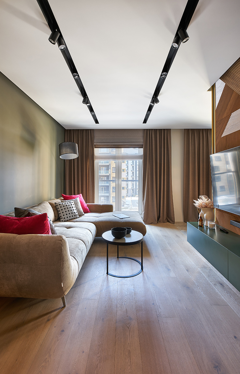 Основное настроение задают различные оттенки зелени и песка и их сочетания, на которых построен весь интерьер. Цвет стен и пола, мебельных фасадов и текстиля идеально дополняют и подчеркивают друг друга, создавая комфортное умиротворяющее пространство. В то же время тонкая работа с цветом и фактурами, умелые акценты делают его интересным и многослойным.