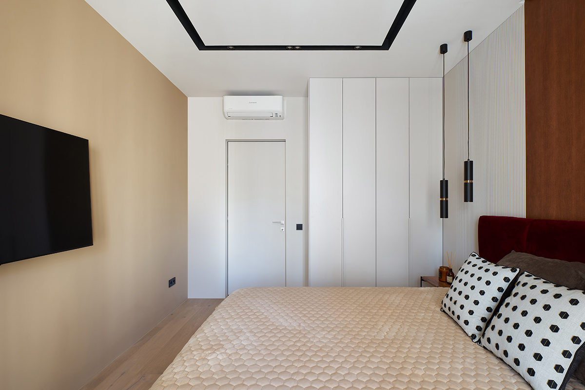 Лишь в спальне от зеленого отказались в пользу более чувственного винного оттенка. Уют и мягкость здесь создают стеновые панели в шпоне дуба, фрезерованные панели в цвет корпусной мебели, а также стена теплого песочного оттенка.
