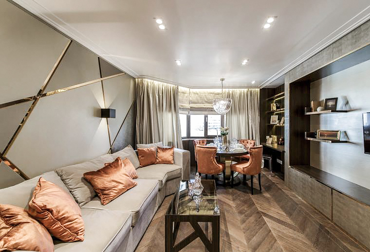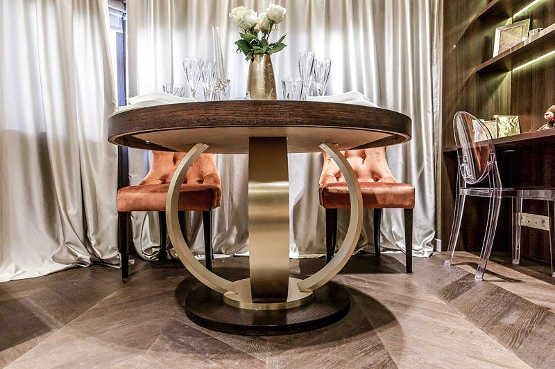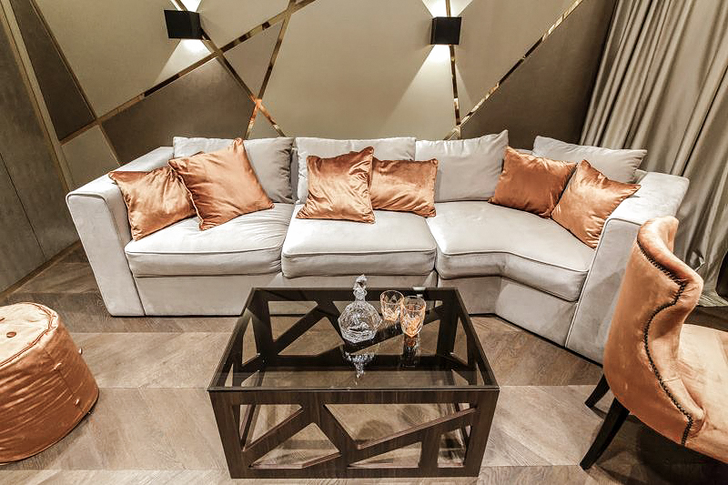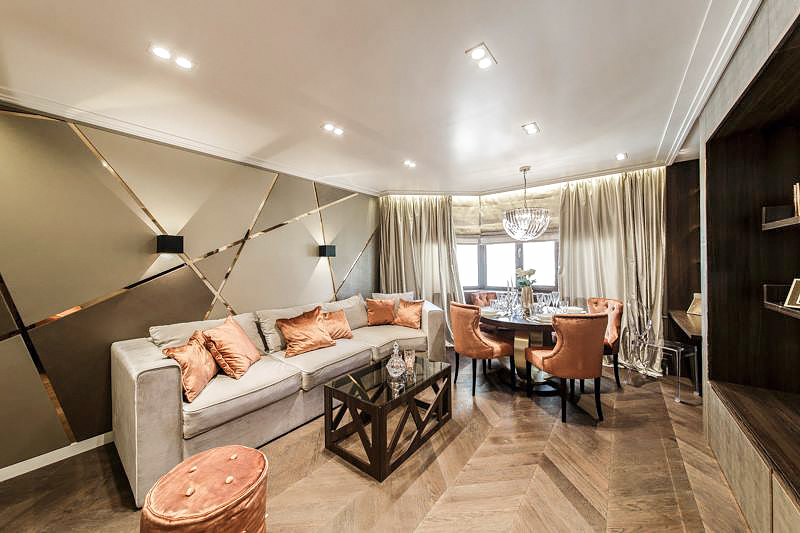 Грамотно зонированное пространство, поделенное на столовую и зону отдыха, продуманные системы хранения, роскошная бархатная обивка мебели, кожаная отделка стен в «солнечных лучах» из металлизированного пластика – интерьер получился не только нарядным, но и удобным.