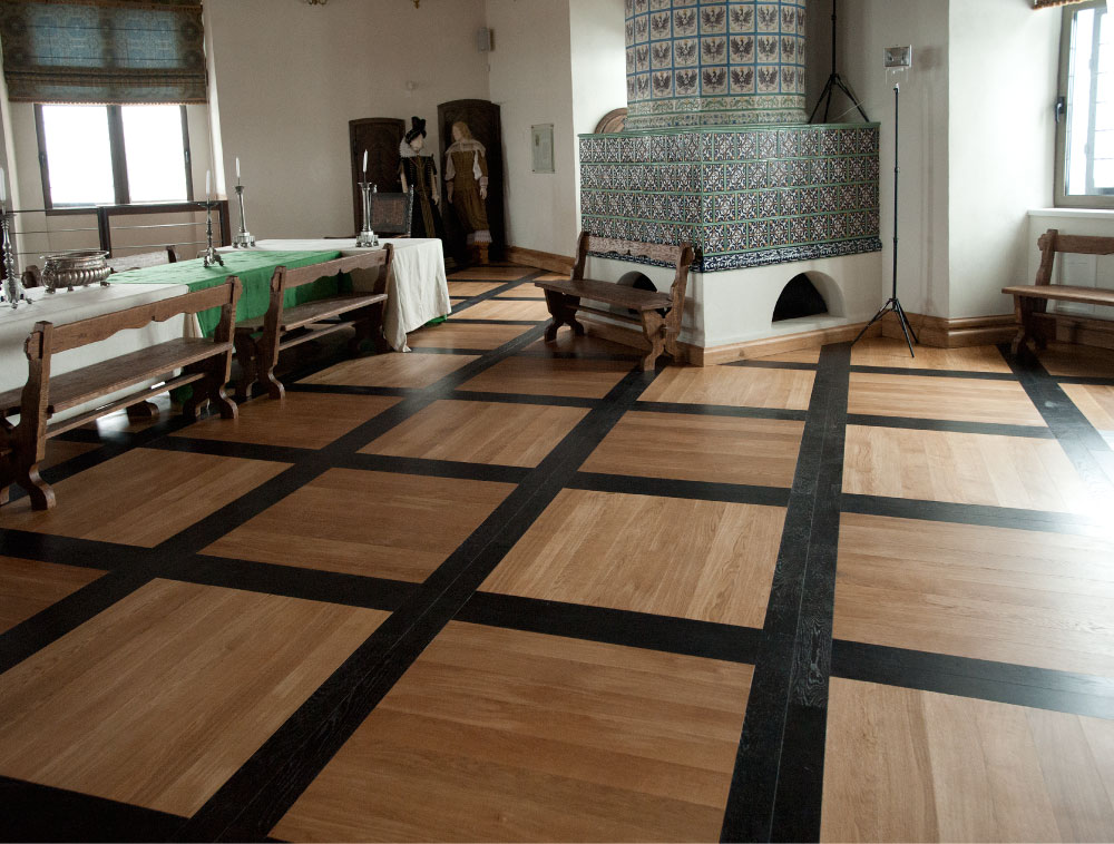 Мирский замок, построенный в 20-х годах XVI века, – один из самых значимых памятников национальной культуры Беларуси, внесенный в Список объектов Всемирного наследия ЮНЕСКО. Участие в реставрации таких важных исторических сооружений – особая ответственность. Для воссоздания оригинального художественного рисунка паркетного пола эпохи Радзивиллов в двух парадных залах старинного замка реставраторы выбрали массивный дубовый паркет Coswick. Необходимо было точно воспроизвести историческую укладку, внешний вид и тонировку покрытия на основе сохранившихся архивных документов. Поэтому паркет для этого проекта изготавливался по специальному заказу. Сложная геометрия помещений со множеством углов требовала особого мастерства установщиков. Каждую планку специалисты компании «Темпла» вручную подрезали на месте, подгоняя под эскиз.