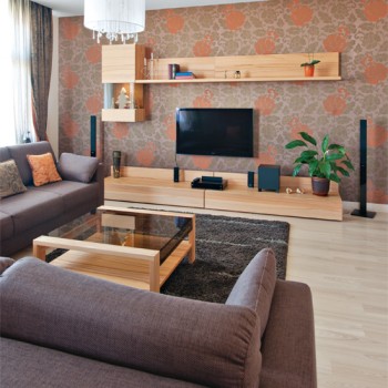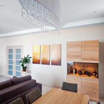 Простые формы, не загромождающие пространство, преобладают и в гостиной. Здесь хозяева по вечерам могут наблюдать за закатом. Мягкие приглушенные цвета успокаивают, фактура материалов создает атмосферу уюта. Отдыхая у телевизора на мягком диване или неспешно беседуя за столом с гостями, хозяева провожают солнце, чтобы на следующий день снова встретить его в своей спальне.