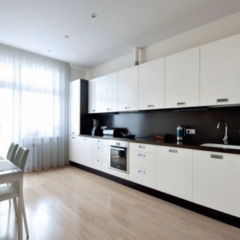 На кухне природную тему продолжают ветви дерева на стене. Все остальное пространство отдано свету, которому ничего не мешает: для кухни выбран минимально необходимый набор мебели.
