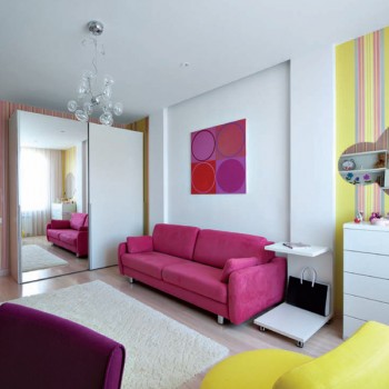 А вот в комнате дочери восход выглядит совсем по-другому: здесь море ярких красок. Желтый, оранжевый, розовый – это цвета начала дня, цвета новых открытий, новых надежд, то есть именно того, что ассоциируется с молодостью. Яркие тона не давят, не раздражают, потому что фоном стал все тот же спокойный белый. Как и в родительской спальне, увеличить объем помогают вертикали и большое зеркало шкафа.
