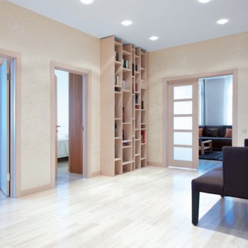 В родительской спальне солнце восходит неспешно, чистый мягкий свет заполняет комнату. Благодаря обилию белого и вертикальным полосам помещение кажется выше и просторнее. Здесь нет ничего лишнего, ведь главное предназначение спальни – отдых.