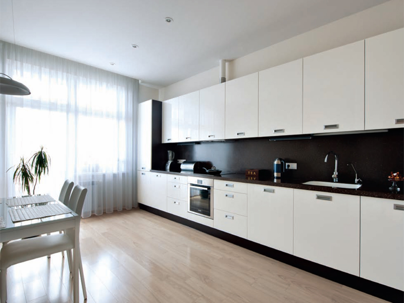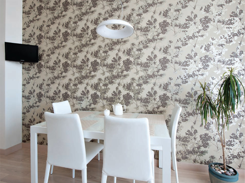 На кухне природную тему продолжают ветви дерева на стене. Все остальное пространство отдано свету, которому ничего не мешает: для кухни выбран минимально необходимый набор мебели.