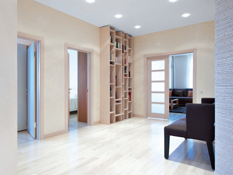 В родительской спальне солнце восходит неспешно, чистый мягкий свет заполняет комнату. Благодаря обилию белого и вертикальным полосам помещение кажется выше и просторнее. Здесь нет ничего лишнего, ведь главное предназначение спальни – отдых.