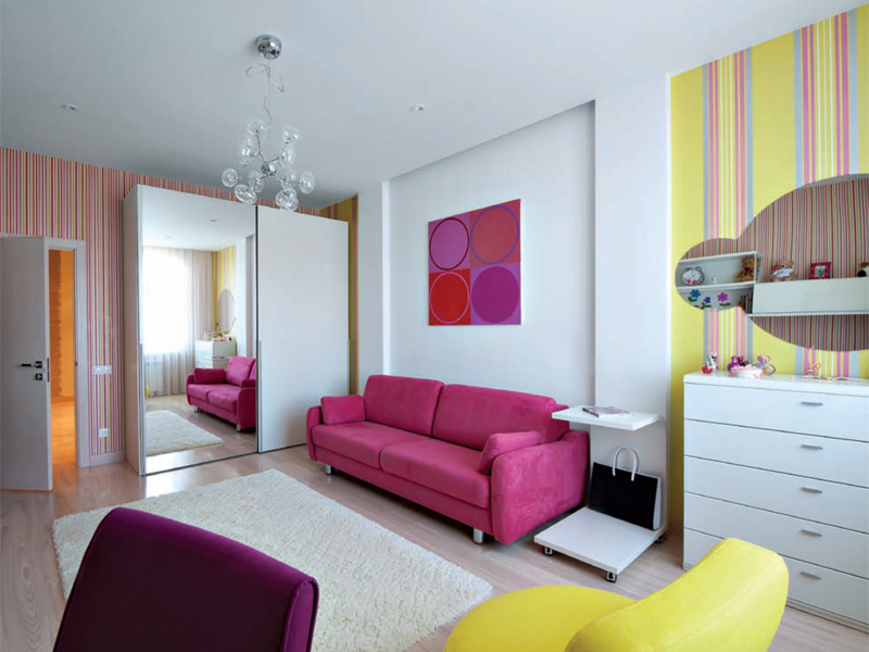 А вот в комнате дочери восход выглядит совсем по-другому: здесь море ярких красок. Желтый, оранжевый, розовый – это цвета начала дня, цвета новых открытий, новых надежд, то есть именно того, что ассоциируется с молодостью. Яркие тона не давят, не раздражают, потому что фоном стал все тот же спокойный белый. Как и в родительской спальне, увеличить объем помогают вертикали и большое зеркало шкафа.