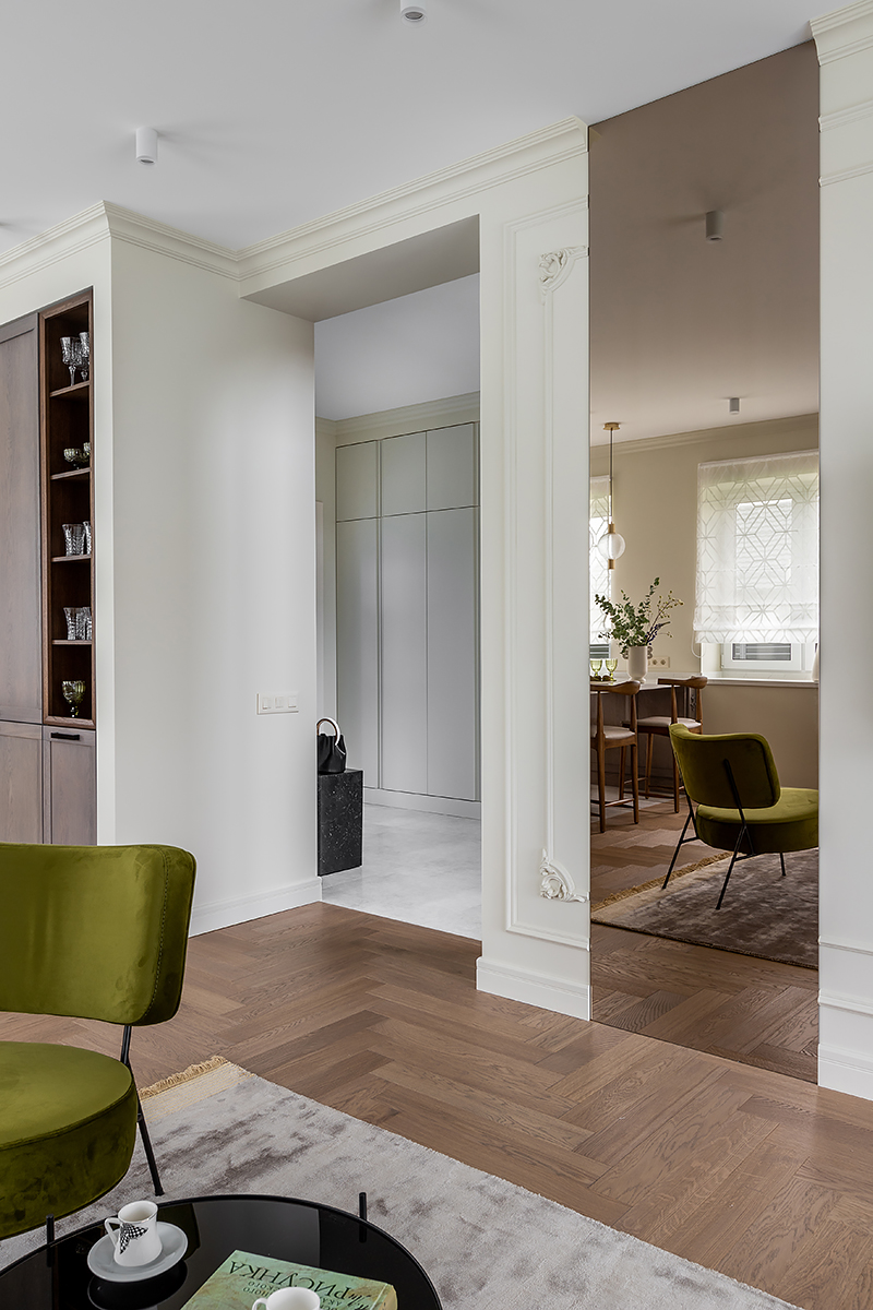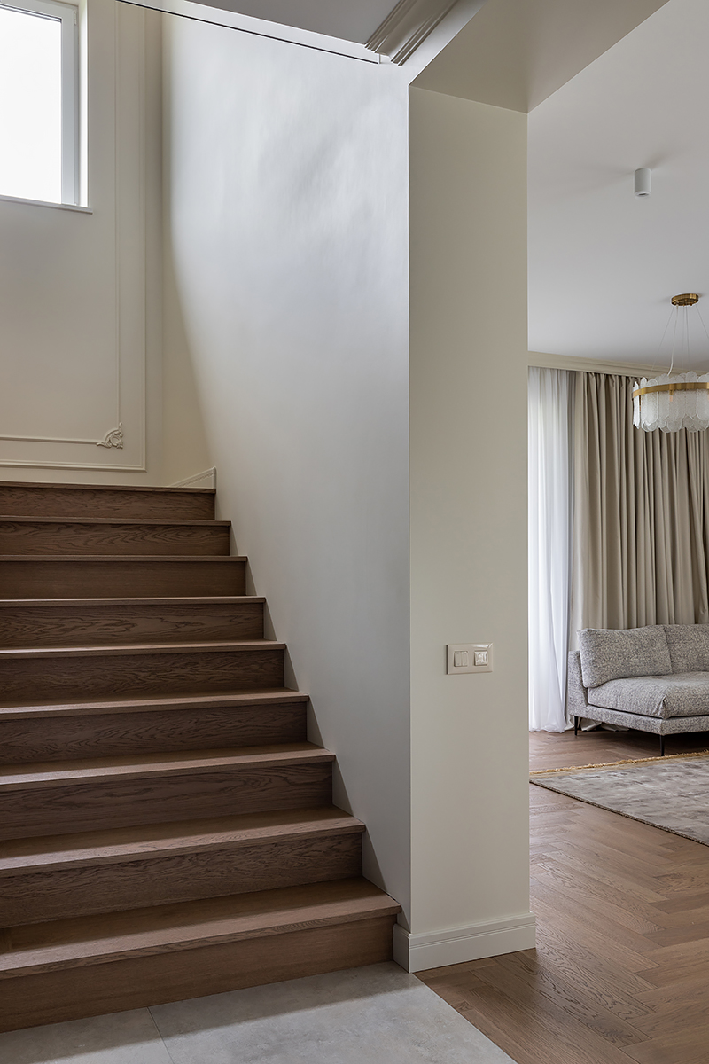 В проекте использован паркет Coswick дуб Пастель из коллекции «Английская елка»; трехслойная паркетная доска дуб Пастель; ступени из инженерного массива дуба в цвете Пастель.