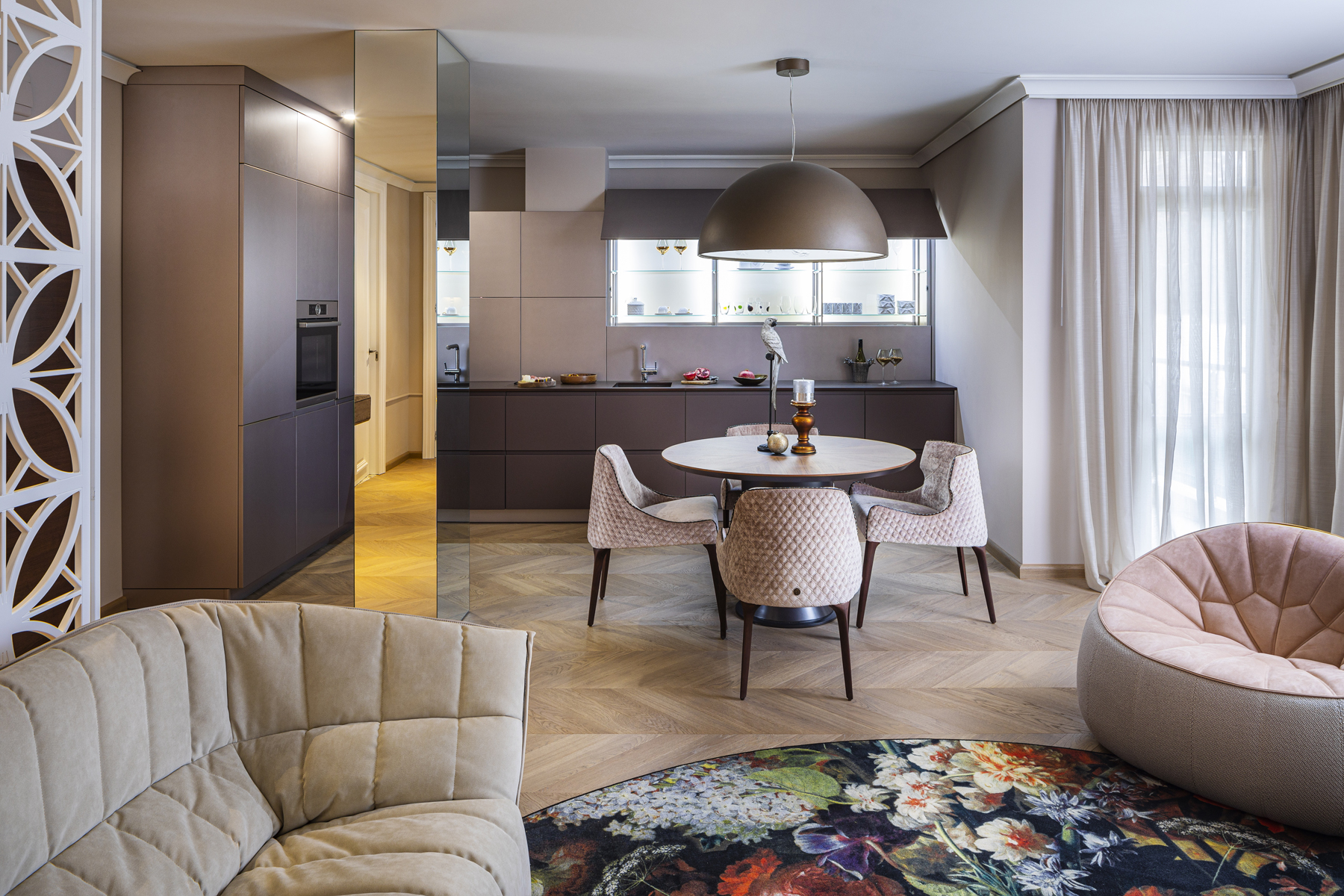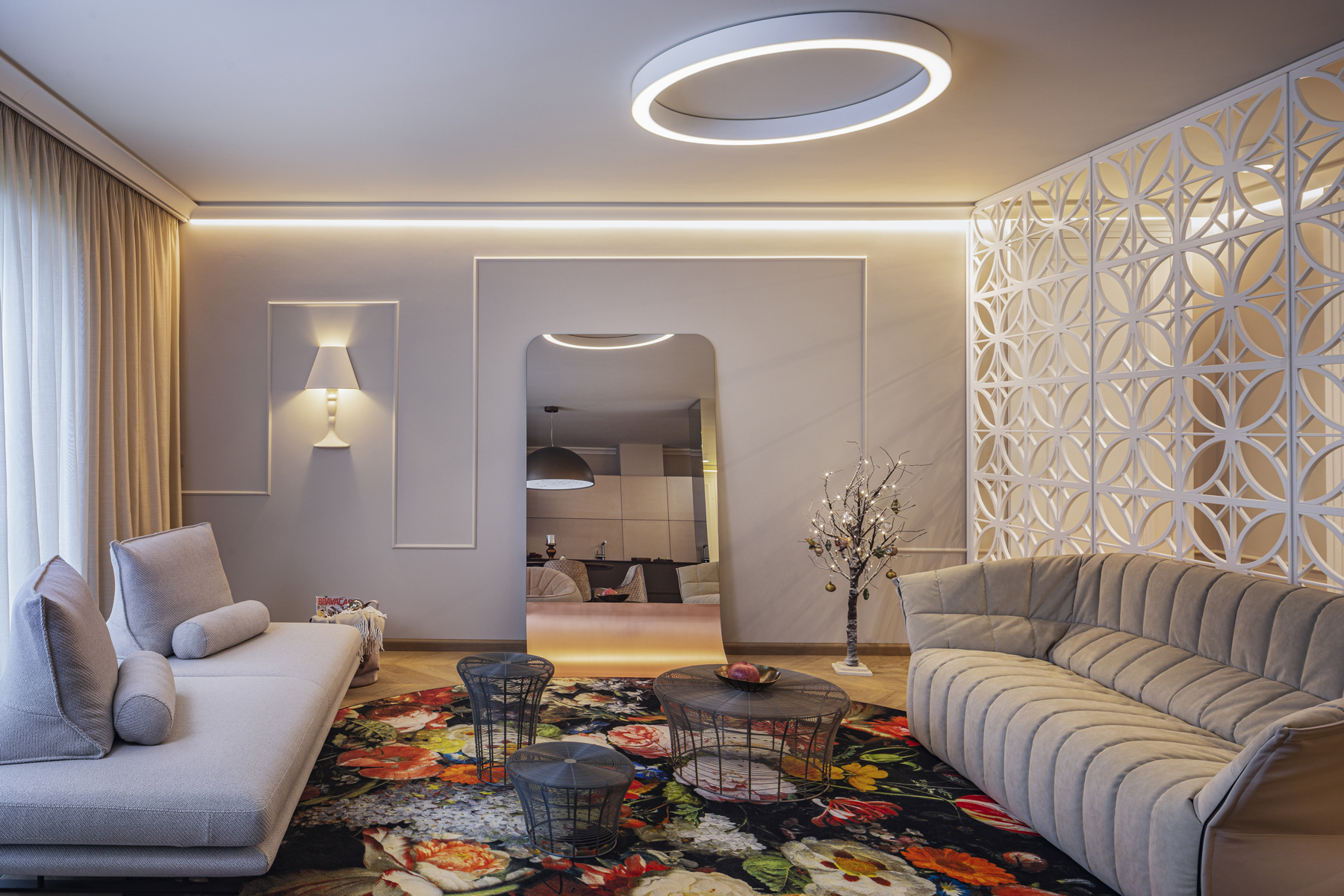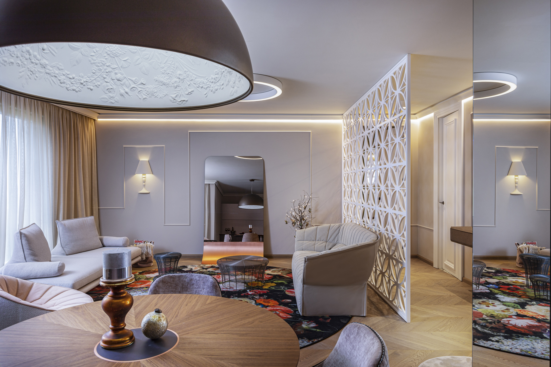 Небольшая, но очень изящная женская квартира в современном стиле с элементами классицизма от болгарского дизайнера Ina Damyanova. Комбинация нежных пастельных оттенков и плавных линий с яркими цветочными акцентами, контраст простых форм и богатых деталей отделки создают небанальную интерпретацию классического интерьера – мягкого и элегантного.