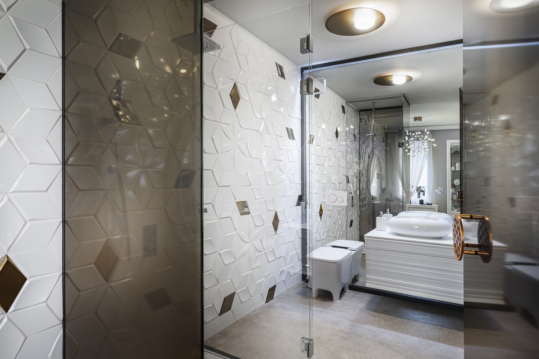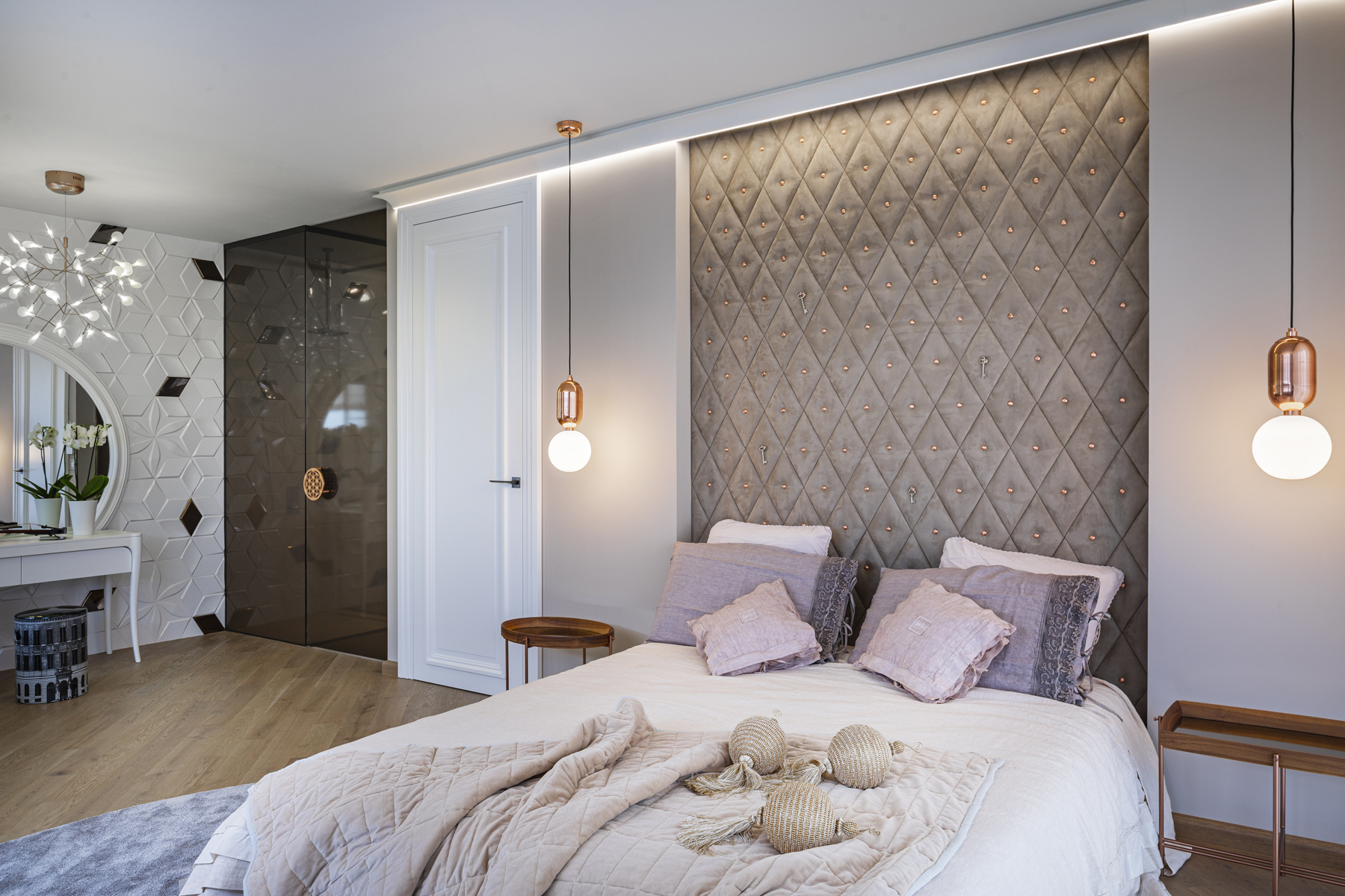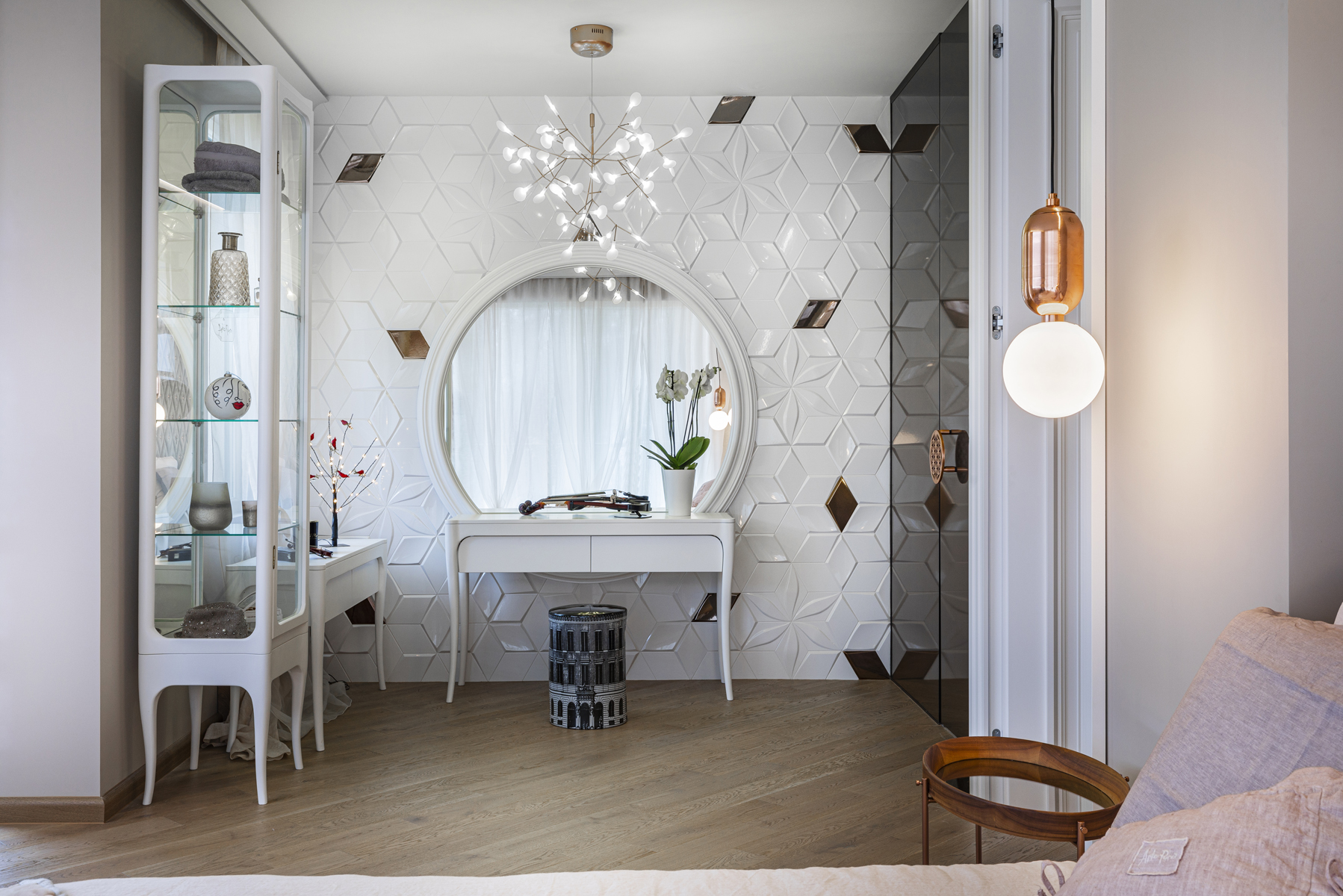 Небольшая, но очень изящная женская квартира в современном стиле с элементами классицизма от болгарского дизайнера Ina Damyanova. Комбинация нежных пастельных оттенков и плавных линий с яркими цветочными акцентами, контраст простых форм и богатых деталей отделки создают небанальную интерпретацию классического интерьера – мягкого и элегантного.