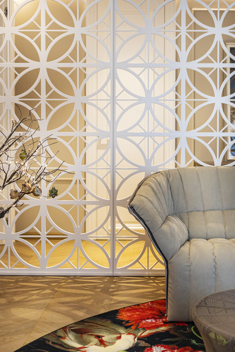 В проекте использованы: трехслойная паркетная доска Coswick дуб Пастель; «французская елка» дуб Пастель.