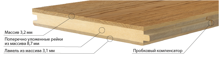 Пробковые компенсаторы в среднем слое снижают внутренние напряжения древесины при колебаниях влажности, обеспечивая дополнительную стабильность паркетной доски.